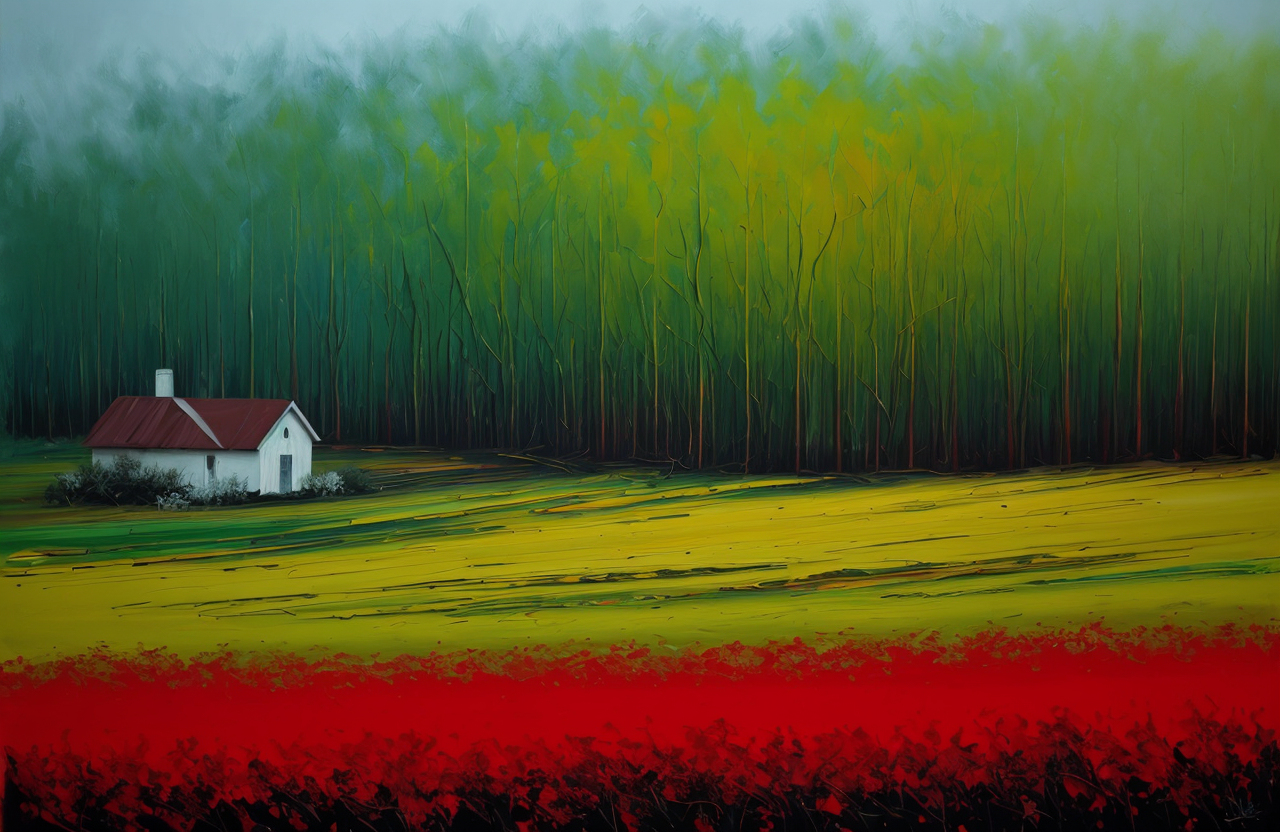 (style of Josh Adamski:1.05), scene painting,scenery,a painting, yard ,ranch ,garden ,clump , Forest ,