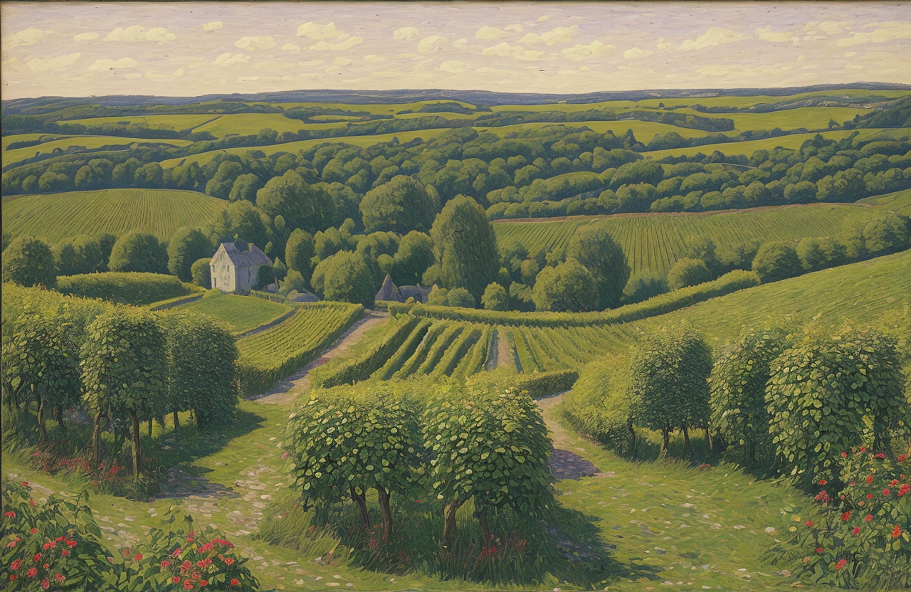 style of Henry Moret, arboretum ,hedgerow,terrace ,clump ,vineyard , Taiga ,