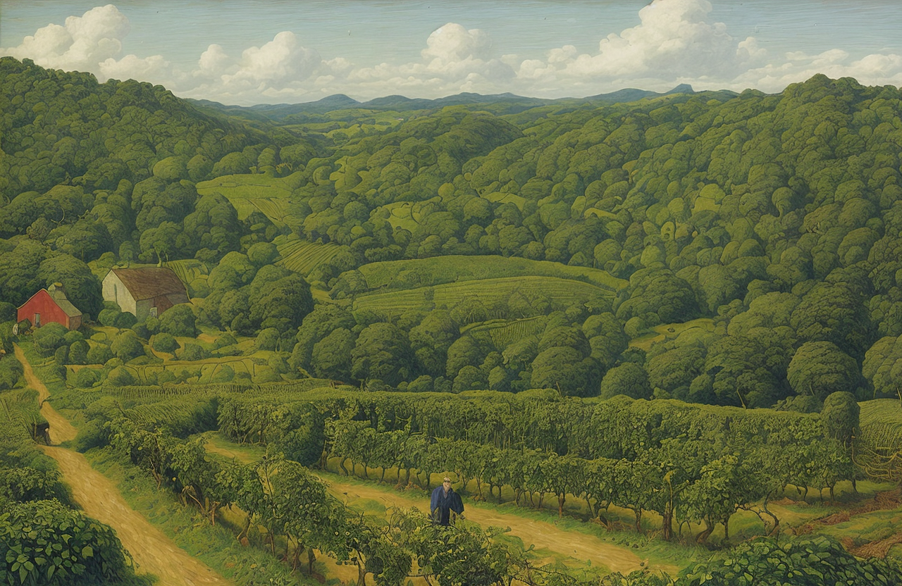 style of Henry Moret, hedgerow,farm ,field ,boscage ,vineyard ,estate , Jungle/Tropical Rainforest ,
