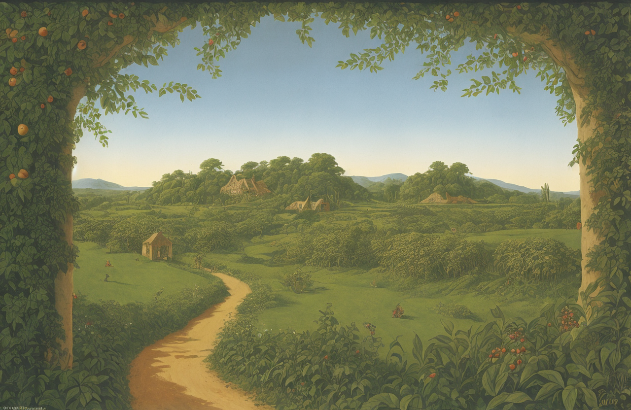 style of Roger Dean, orchard ,hacienda ,terrace ,hedgerow, Taiga ,