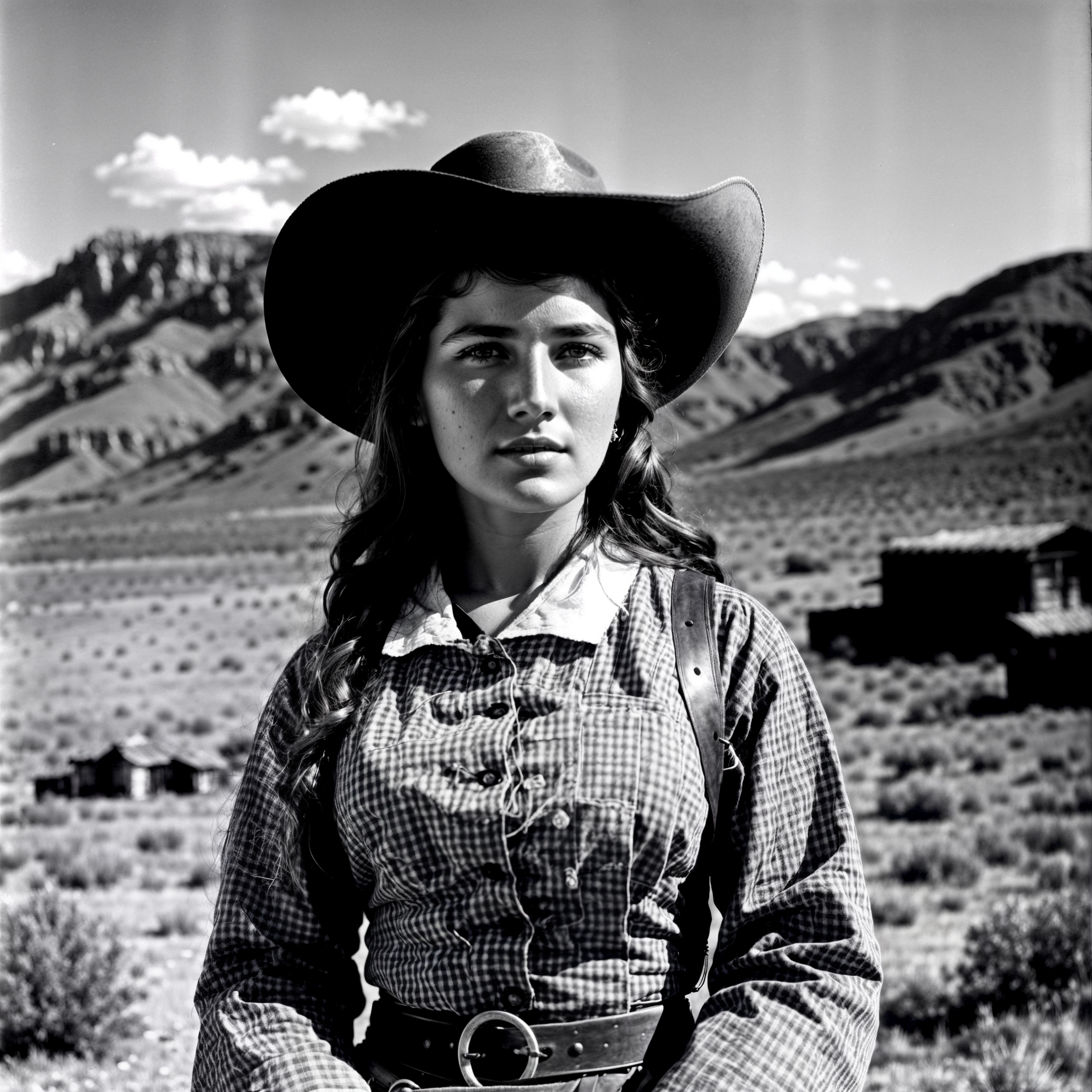 RAW, photorealistic, best_quality, cowboy-shot of a woman in the western american frontier, year 1860, the style of Ansel Adams