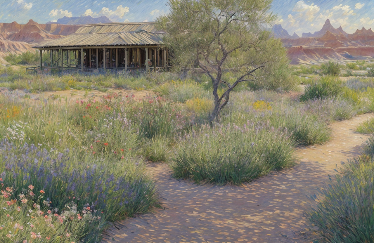 (impressionism:1.05), scenery,scene painting,a painting, parcel ,arboretum ,thicket ,ranch ,hacienda , Badlands ,