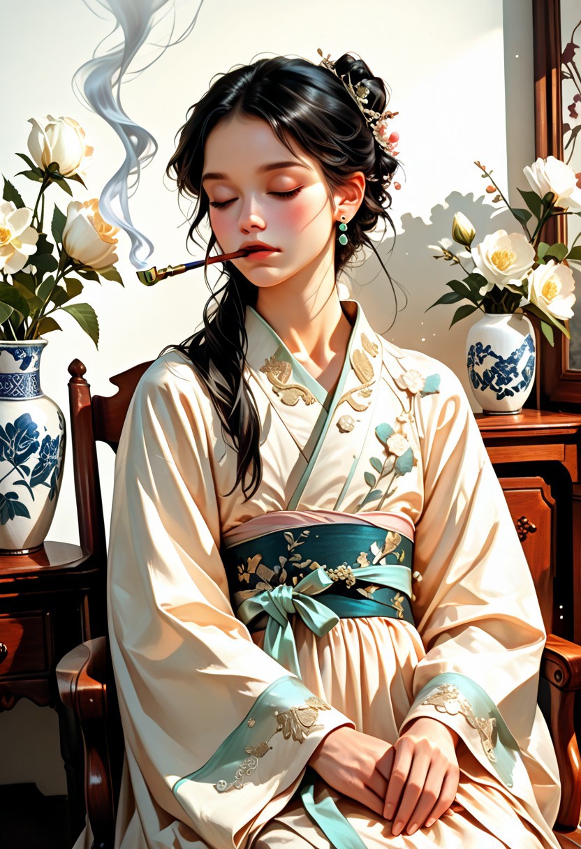 solo, short black hair, elegant man, seated, holding a long kiseru smoking pipe, traditional Hanfu-style silk robe, white with delicate embroidery, floral patterns, tied sash, flat chest, graceful pose, closed eyes, long sleeves, white flower vase in the background, ornate wooden chair, ethereal smoke, gentle lighting, earrings, realistic facial features, attractive , calm atmosphere, flower vase decor, semi-realistic style, digital painting, concept art, soft glow, dusty cool tones, volumetric lighting, ultrahigh definition, absurdres, highres, very aesthetic, painted style, moody light, contrast of white fabric and dark wood, misty effect, light particles, serene, Midjourney style, elegant composition, aidma-niji