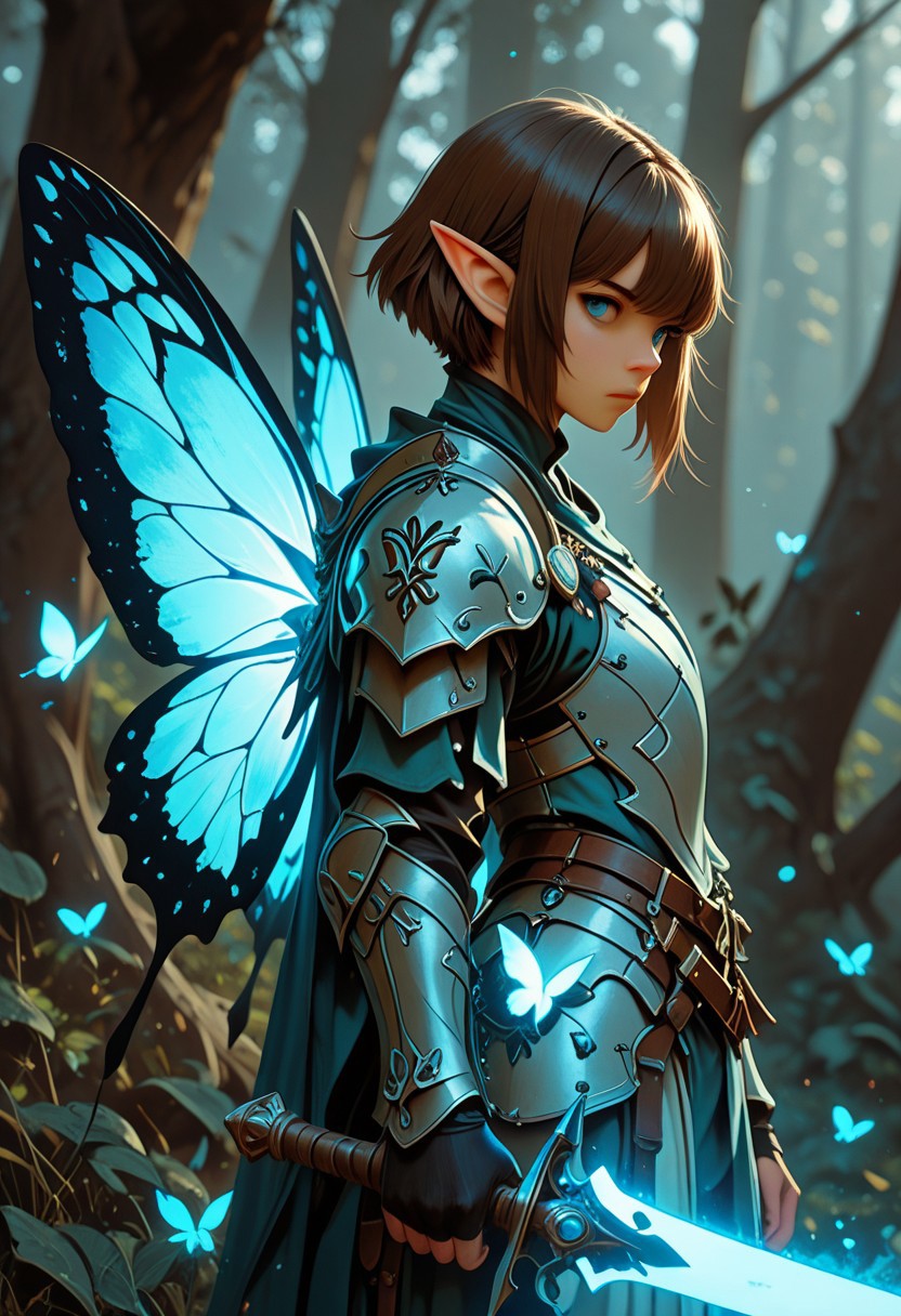 score_9_up, score_8_up, score_7_up, score_6_up. masterpiece, best quality, good quality, very aesthetic, absurdres, semirealism, fantasy, 8K, depth of field, focused subject, cowboy shot, Elf knight, 19yo, androgynous, pointed ears, short brown hair, male haircut, blue eyes, wearing detailed armor, wielding blue glowing sword, he is standing, sword resting against the ground, large white glowing butterfly wings on the knight's back, trees in background, hkvaloria