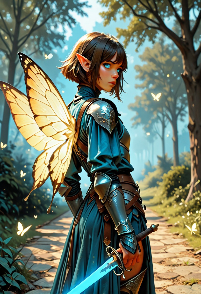 score_9_up, score_8_up, score_7_up, score_6_up. masterpiece, best quality, good quality, very aesthetic, absurdres, semirealism, hkvaloria, RapierXL, fantasy, 8K, depth of field, focused subject, cowboy shot, not tanned Elf knight:1.3, 19yo male, androgynous, pointed ears, short brown hair, male haircut, blue eyes, wearing detailed armor, fully armored, he is standing, holding sword, rapier, weapon, blue glowing sword, large white glowing butterfly wings on the knight's back, park,