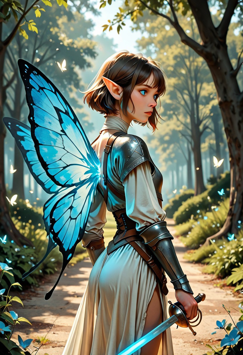 score_9_up, score_8_up, score_7_up, score_6_up. masterpiece, best quality, good quality, very aesthetic, absurdres, semirealism, RapierXL, fantasy, 8K, depth of field, focused subject, cowboy shot, Elf knight, 19yo male, fairy, androgynous, pointed ears, short brown hair, male haircut, blue eyes, wearing detailed armor, he is standing, holding sword, rapier, weapon, blue glowing sword, large white glowing butterfly wings on the knight's back, park,