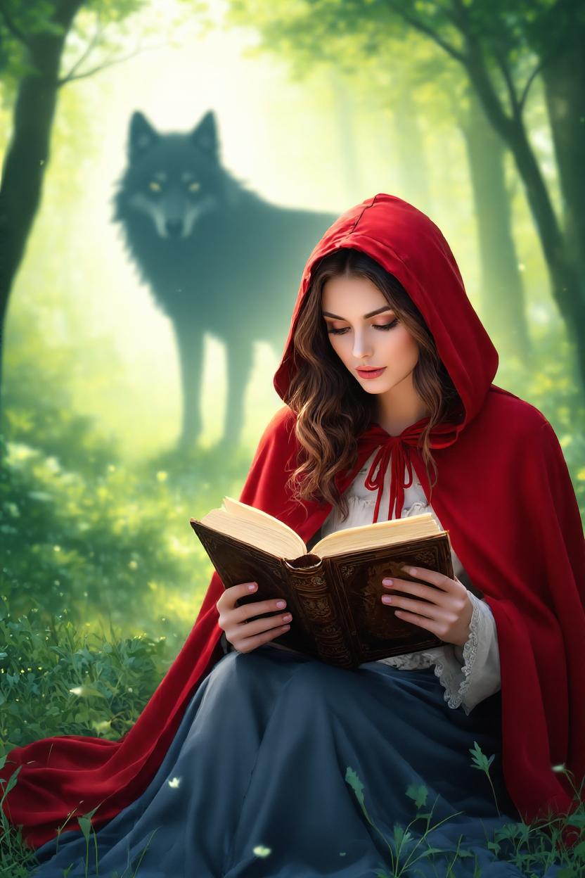 A pretty woman in red hood reading an ancient fairy book in the bright green forest. In the backgrounds there is a shadow of big wolf.