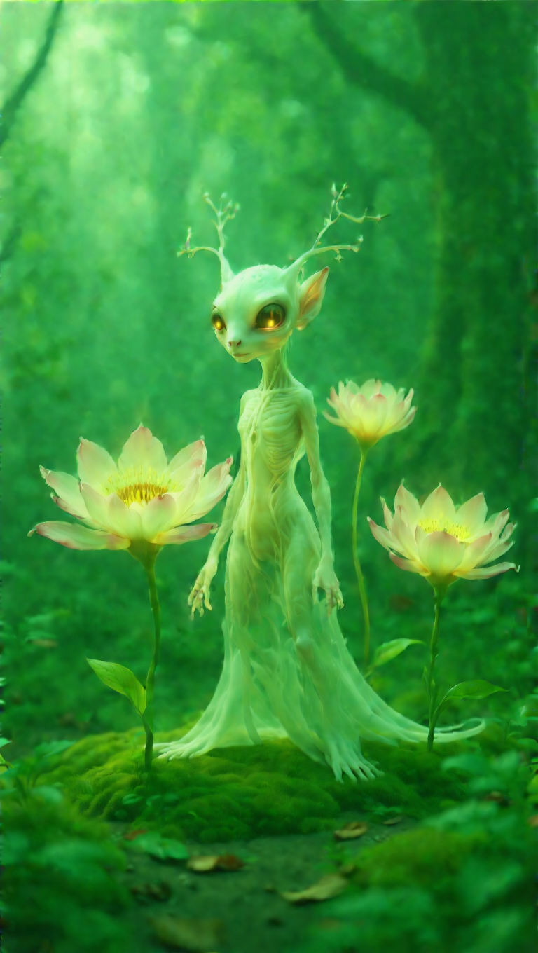 The image depicts a fantastical scene set in a lush, enchanted forest. The focal point is a delicate, ethereal creature that appears to be a blend of plant and humanoid form. This creature has a translucent, almost glass-like body with intricate, vein-like patterns running throughout. Its limbs and torso are slender and elongated, giving it an otherworldly appearance. The creature's head is rounded with large, luminous yellow eyes that seem to glow softly, adding to its mystical aura. It has small, pointed ears or antennae protruding from its head, enhancing its otherworldly look. The creature's skin is a gradient of translucent hues, with subtle red accents at various points, particularly around its joints and the inside base of its body. Surrounding the creature are two large, glowing flowers that resemble lotus flowers. These flowers have a soft, ethereal light emanating from their centers, with petals that are a gradient of white to light pink. The flowers are connected to the creature by slender, elongated stems that are also translucent and veined. The background is a dense, verdant forest with a soft, diffused light filtering through the canopy, creating a mystical and serene atmosphere. The ground is covered in moss, small plants, and fallen leaves, adding to the natural, enchanted setting.