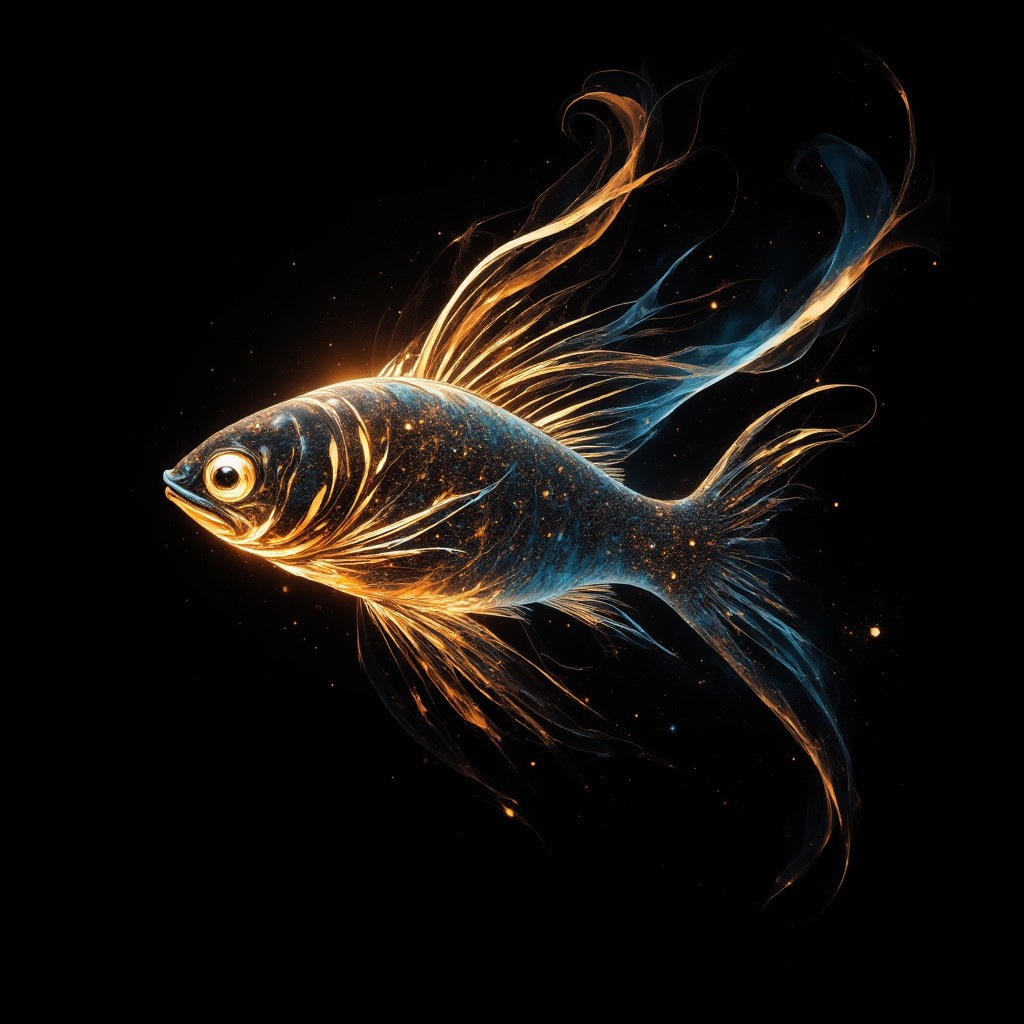 fish made out of singular intricately flowing light strands against a black background, swirling particles, abstract graphics, contours of a burning tree hidden in smoke, majestic, concept art, flowing light, glowing dust