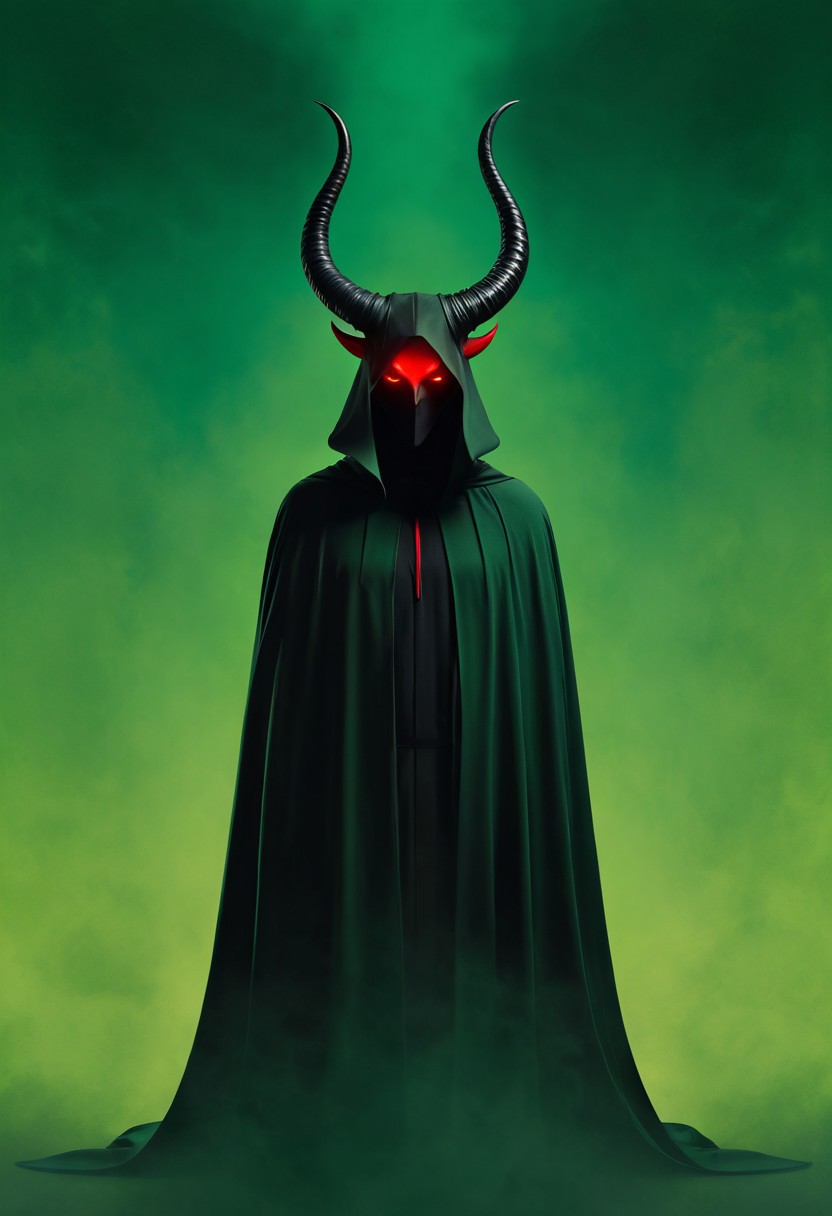 surreal minimalism, demonic figure, glowing red eyes, twisted horns, bold flat colors, dark cloak, negative space, abstract symbolism, haunting atmosphere, simplified forms, psychological horror, muted green background, surreal storytelling, expressive silhouette, poetic abstraction, graphic surrealism, mysterious contrast, dreamlike tension