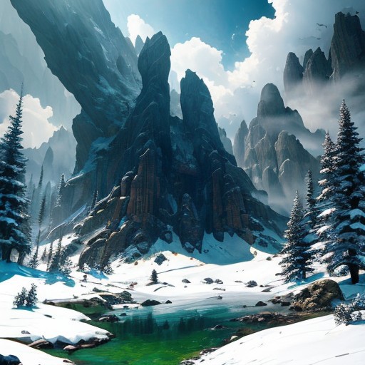 RAW photo, (masterpiece:1.3), subsurface scattering, heavy shadow, (high quality:1.4), (intricate, high detail:1.2), professional color photography, HDR, High Dynamic Range, realistic, ultra realistic, photorealistic, high resolution, film photography, ambient lighting, atmospheric effects, <lora:detail_slider_v4:2>, OverallDetail, <lora:storybook_last:1>, <lora:FantasyMountains:1>,arch, architecture, bird, building, cliff, cloud, cloudy sky, dark, day, fanmou, fog, forest, from behind, grass, house, landscape, mountain, mountainous horizon, nature, no humans, outdoors, painting \(medium\), pine tree, reflection, river, road, rock, ruins, scenery, sky, snow, solo, stream, tree, wide shot