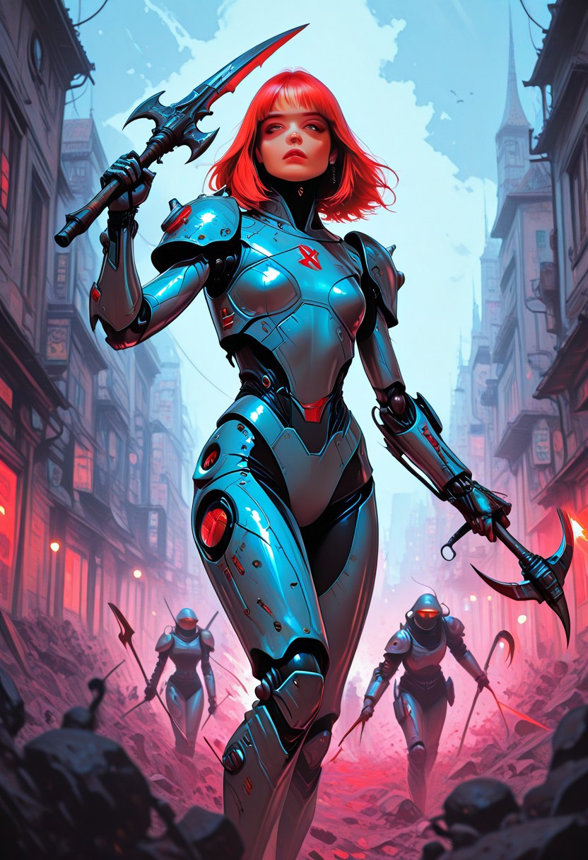 masterpiece, best quality, good quality, very aesthetic, absurdres, newest, 8K, depth of field, focused subject, in the style of cksc BREAK asian young cyborg woman, robot joints, bangs, long bright blue bioluminescent hair, red plated armour, holding poleaxe, battle stance, dynamic angle, ancient fantasy city, directional lighting,