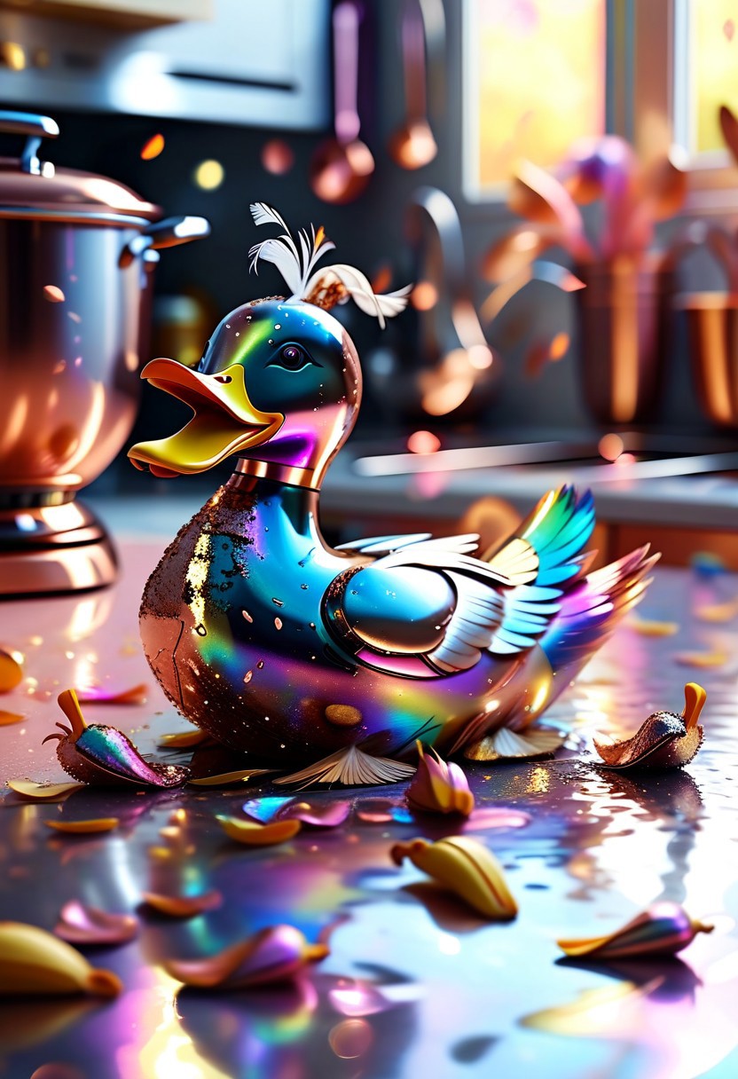 clumsy robotic duck made of l1qu1dp34rl and bouncy rose gold metal, slipping on a rainbow banana peel in a pearlescent kitchen, feathers mid-flop, surreal slapstick shimmer