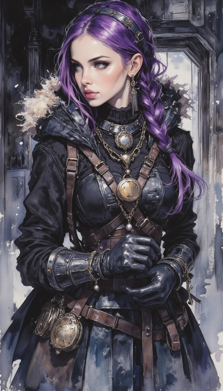 watercolor painting, Style of Andreas Achenbach, Style of Alena Aenami, Style of Leonid Afremov, Style of Helen Allingham, Style of Albrecht Altdorfer, Style of Alois Arnegger, Style of Peder Balke, Style of Gifford Beal, her bright purple hair is long and flowing, she has a band of metal that goes around her forehead and under her hair, her lipstick is dark purple, she has a tanned complexion, she wears leather armor over a black pullover sweater and a black pleated skirt, she wear black metal gloves, around her neck is a metal chain with metal claws hanging from it and a locket as the centerpiece, she wears long dangling earrings with dewdrop pearls at the ends, she is quite and contemplative, the background is the dark interior of a spaceship, Studio Ghibli Dark Fairytale
