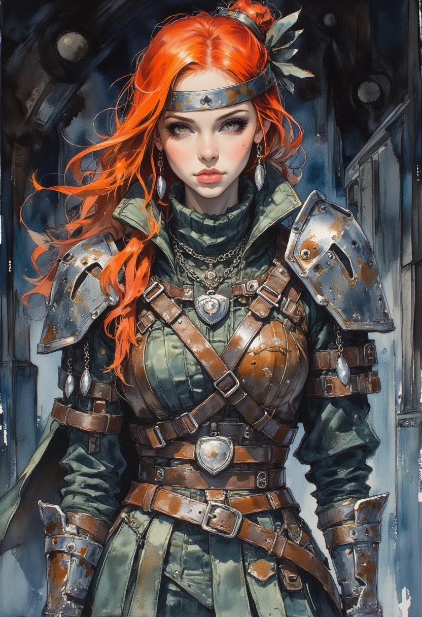 watercolor painting, Style of Andreas Achenbach, Style of Alena Aenami, Style of Leonid Afremov, Style of Helen Allingham, Style of Albrecht Altdorfer, Style of Alois Arnegger, Style of Peder Balke, Style of Gifford Beal, her bright red hair is long and flowing, she has a band of metal that goes around her forehead and under her hair, her lipstick is pale red, she has a pale and freckled complexion, she wears leather armor over a dark green pullover sweater and a dark green pleated skirt, she wear silver metal gloves, around her neck is a metal chain with metal claws hanging from it and a locket as the centerpiece, she wears long dangling earrings with dewdrop pearls at the ends, she is quite and contemplative, the background is the dark interior of a spaceship, Studio Ghibli Dark Fairytale