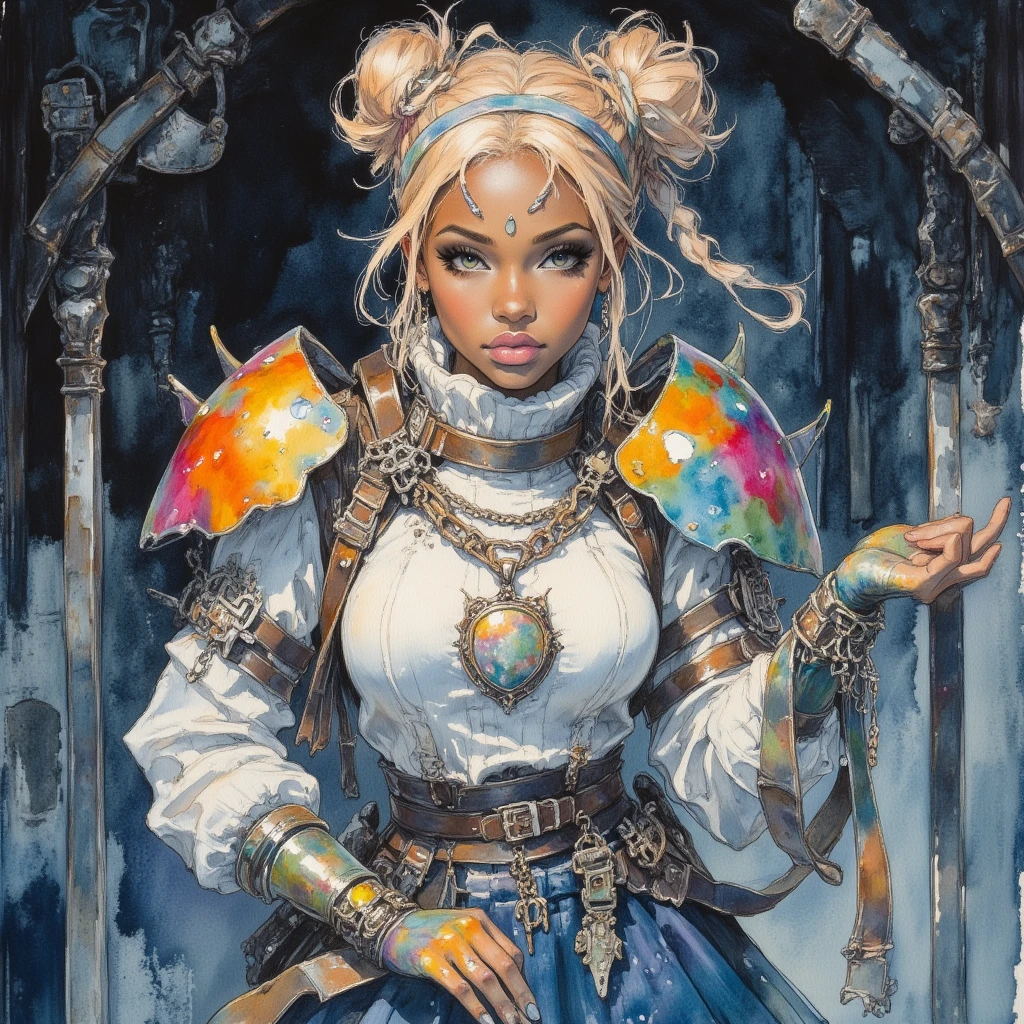watercolor painting, Style of Andreas Achenbach, Style of Alena Aenami, Style of Leonid Afremov, Style of Helen Allingham, Style of Albrecht Altdorfer, Style of Alois Arnegger, Style of Peder Balke, Style of Gifford Beal, her pale orange hair is up in an elaborate hairstyle, she has a band of metal that goes around her forehead and under her hair, her lipstick is pale purple, she is dark skinned, she wears leather armor over a pale blue pullover sweater and a dark blue pleated skirt, she wear shiny rainbow metal gloves, around her neck is a metal chain with metal claws hanging from it and a locket as the centerpiece, she wears long dangling earrings with dewdrop pearls at the ends, she is sweet and friendly, the background is the dark interior of a spaceship, Studio Ghibli Dark Fairytale