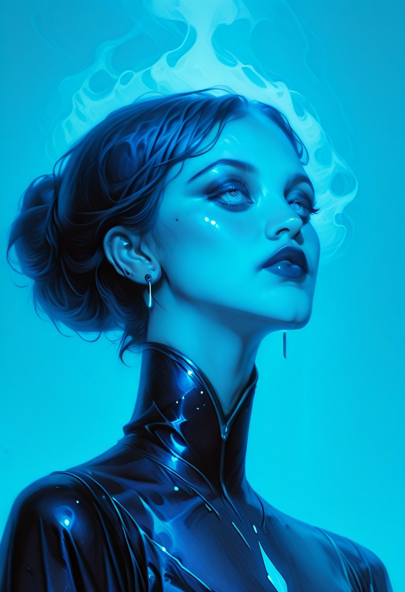 Art by Eli Minaya. A digital illustration in style of James C. Christensen Ethereal minimalist Alien race cybergoth fashion photography drawing, in the style of teal and gold, waist-high portrait, intricate, sharp focus, concept art, background zentangle fog.