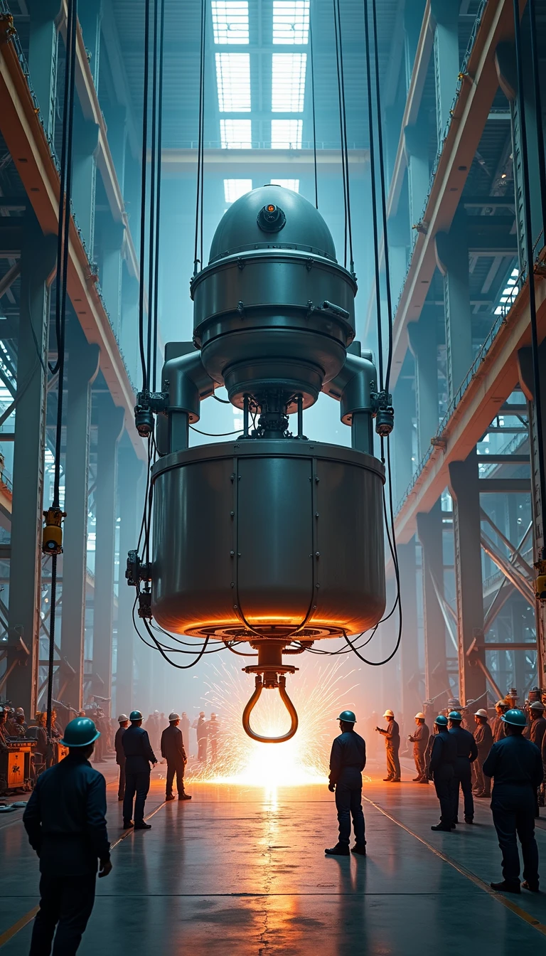 A massive high-tech industrial stand mixer is being assembled in an enormous industrial factory. The mixer is suspended in the air by mechanical cranes and robotic arms, with dozens of engineers and factory workers in safety helmets working around it. Sparks fly as welding is done in the background, and the factory is illuminated by large industrial lights. The setting is futuristic, with a mix of traditional heavy machinery and advanced robotic systems. The perspective emphasizes the immense size of the stand mixer, making it appear as large as a vehicle. The atmosphere is dynamic, with workers engaged in various tasks, adding a sense of realism and scale. The name of the factory is ”Diamond Europe”