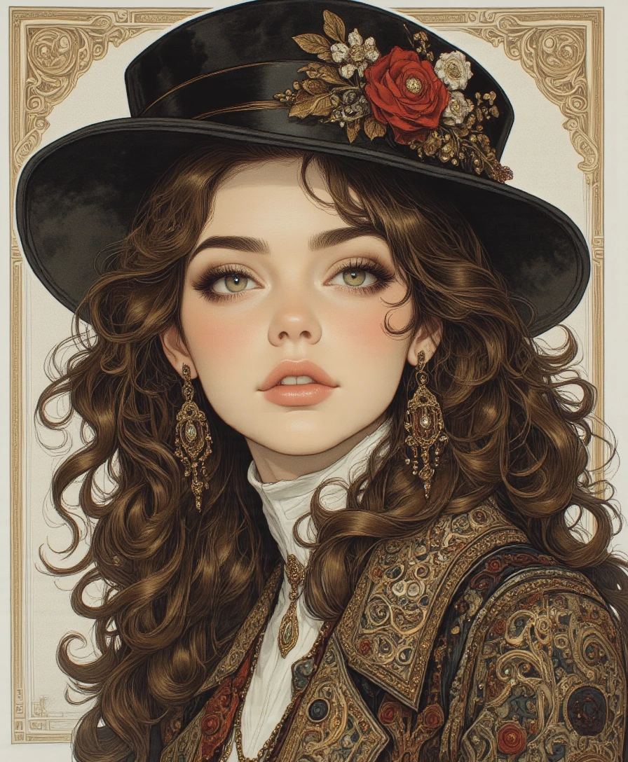 Style of Sandra Chevrier, a lovely woman, she is from the early 20th century America, her long hair is brown and curly, her eyes are brown, her skin tone is pale, she wears clothes of the upper class in 1930s Ohio, she is wealthy, her family was not affected by the depression and her clothes reflect this continued wealth,, mad-cyberspace, Studio Ghibli Dark Fairytale