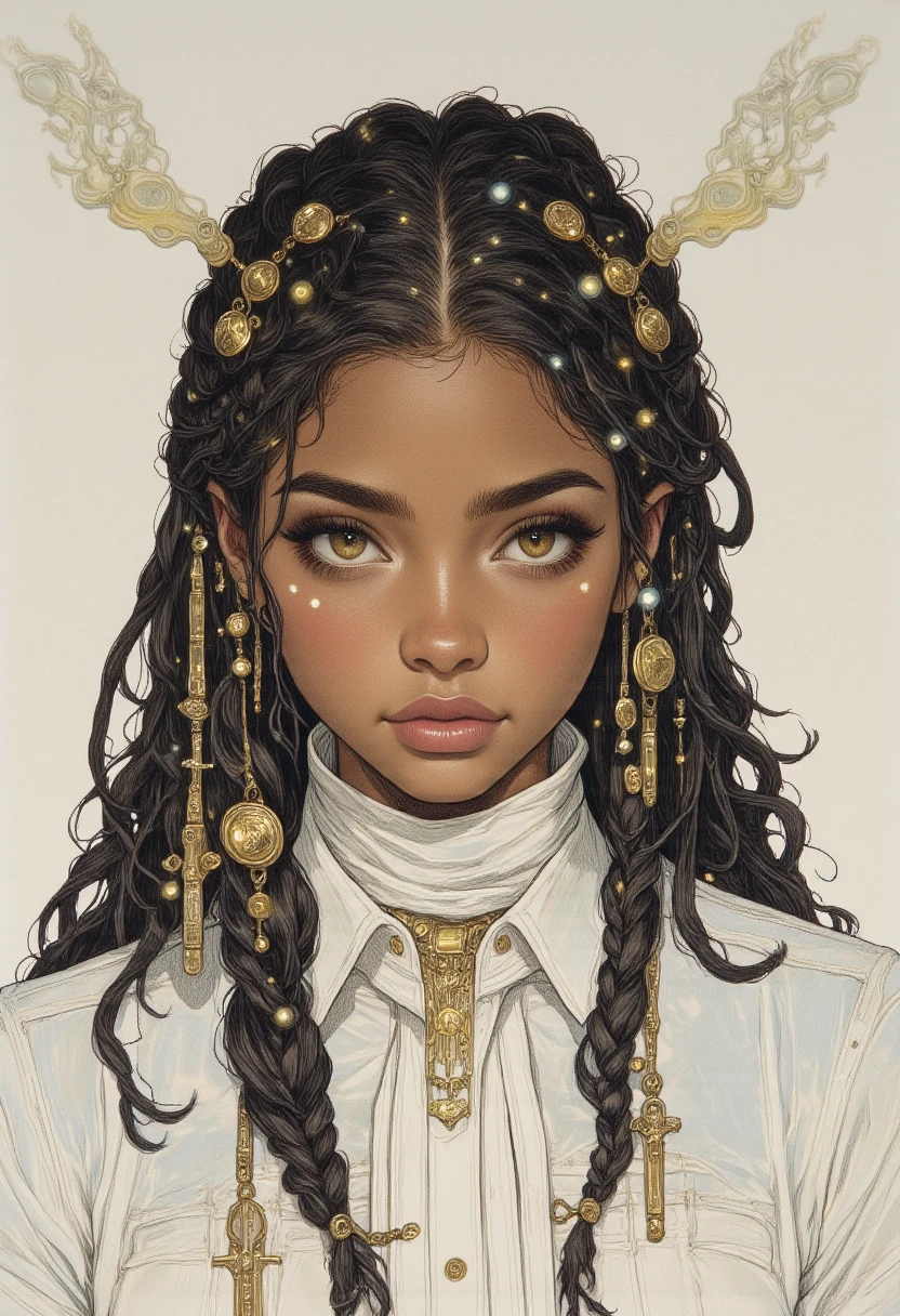 pencil sketch mixed with watercolors, Style of Henry Darger, Style of Henri-Edmond Cross, Style of Farel Dalrymple, her black hair is in locs with gold caps, she has brown eyes, her skin is a dark tone, white cloth necklace, white blouse, magical lights illuminate the area around her, she has an ethreal look to her, she has neutral lipgloss, mad-cyberspace, Studio Ghibli Dark Fairytale