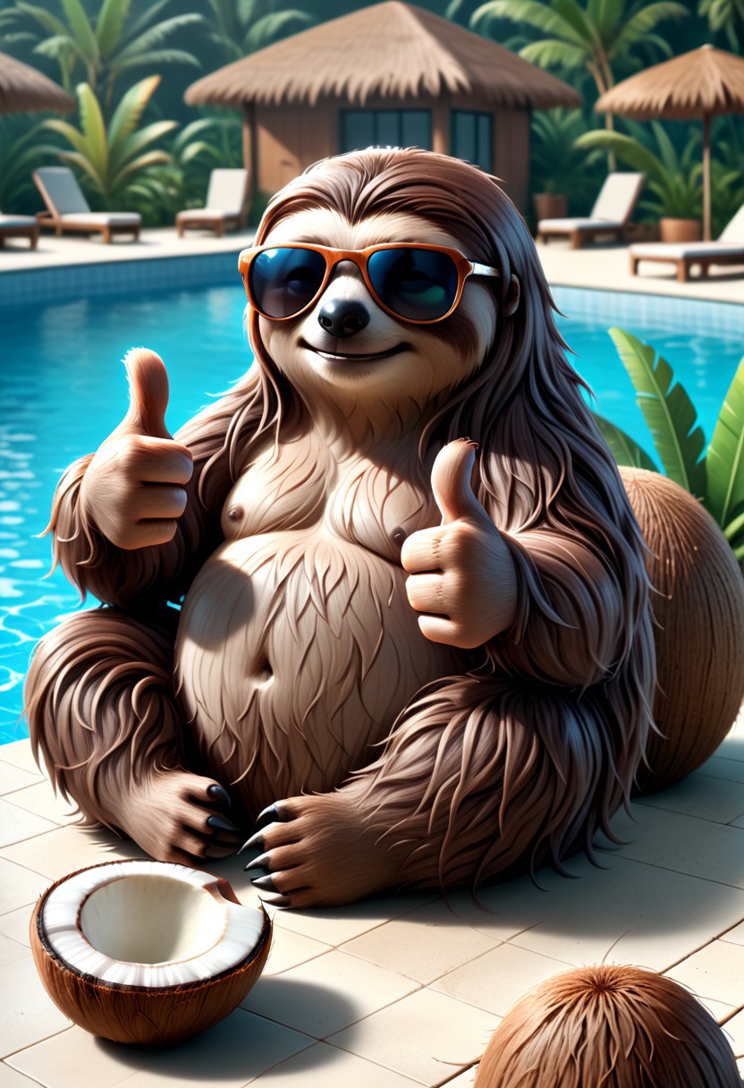embedding:lazympos, cracked coconut made of w00kiee, sloth sitting in cocount, sunglasses, thumbs up, pool