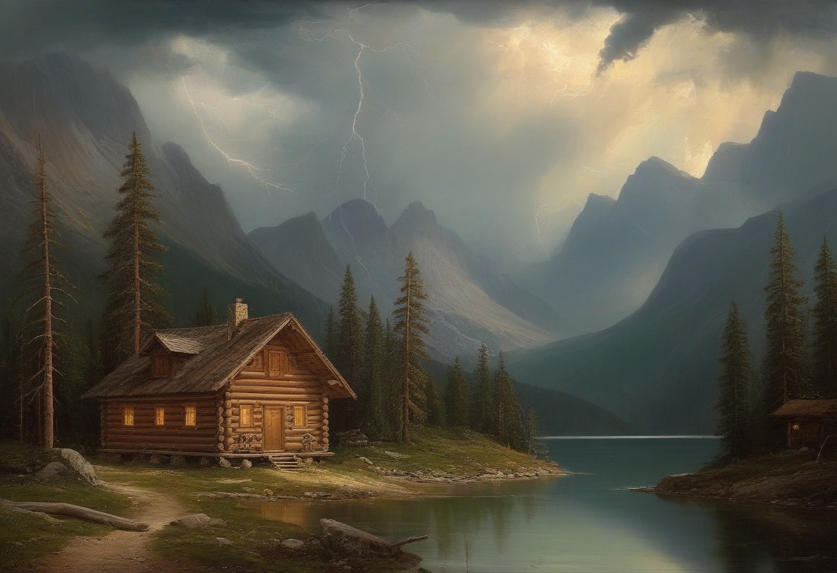 Masterpiece, high-resolution, oil painting, tall mountains, pine forest, log cabin, lake, large thunderstorm clouds in the distance