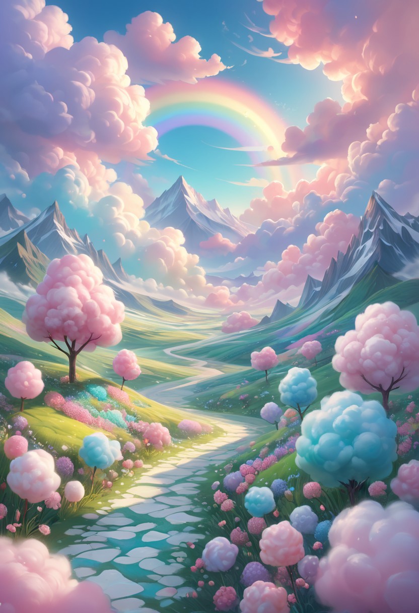 A breathtaking, hyperrealistic digital painting, a surreal, dreamlike landscape, rendered in a whimsical pastel color palette. The planet’s surface is intensely marbled with swirling patterns of lighter and darker hues, radiating a soft, diffused glow from below, casting ethereal shadows across the scene. In the sky clouds of rainbow bubbles drift, Below, a sinuous, winding path constructed of polished, smooth crystal material spirals downwards towards the viewer, leading into a dense, swirling cotton candy field – countless iridescent candies in shades of white, lavender, shimmering blue, and emerald green float freely, in the far distance is mountain of chocolate, creating a hazy, dreamlike atmosphere. swirling blue and green clouds, dramatic volumetric lighting, creating a sense of vastness, adventure, and intense exploration – 8k resolution, trending on ArtStation.