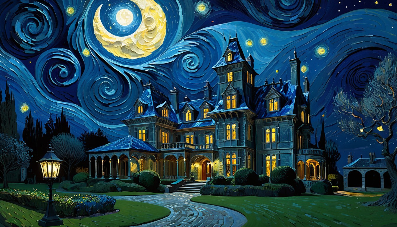 landscape, CGI render, modern, very tight brushstrokes, Van Gogh-inspired Post-Expressionist nocturne of a swirling, starry, and crescent moonlit Wayne Manor, landscape with bold, expressive textures, blue and gray tones, 2025, intricately detailed, refined, defined, highly detailed, follow negative prompts,