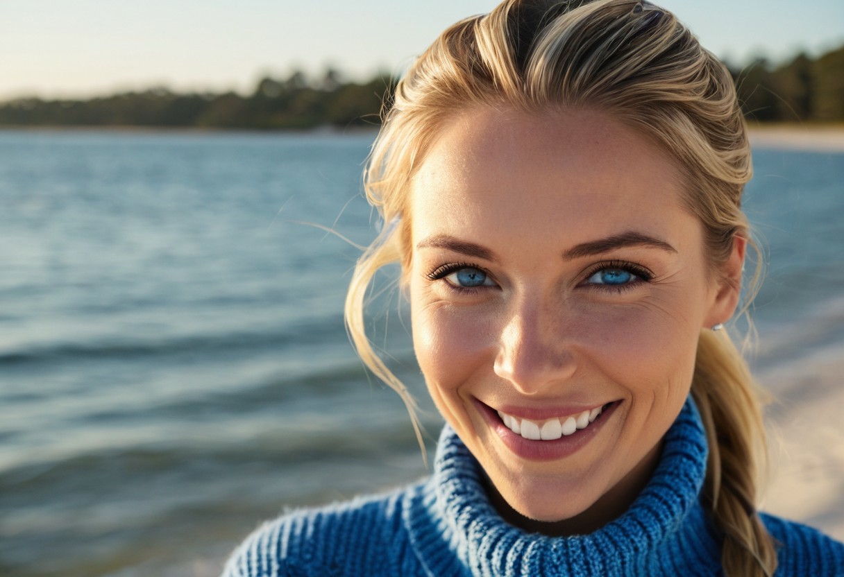 A hyper-detailed, high-resolution (8K) image of a 35-year-old woman with sleek blonde hair tied back, facing the camera;beautiful and perfect absolutely natural face, not plastic look,wearing an oversized detailed blue knit sweater. Her striking blue eyes gleam with warmth, framed by delicate laugh lines that enhance her inviting charm. subtle wrinkles on her face, natural skin texture. Captured with a wide-angle lens, without distortion. 10 feet away from the lens, enjoying the golden afternoon light. Shot with a Nikon D5300, 50mm lens, f/2.8, ISO 100. Natural sunlight highlights her face and outfit. Background: Hilton Head architecture and the Ocean in soft focus. Inspired by Peter Lindbergh’s natural elegance in urban travel.