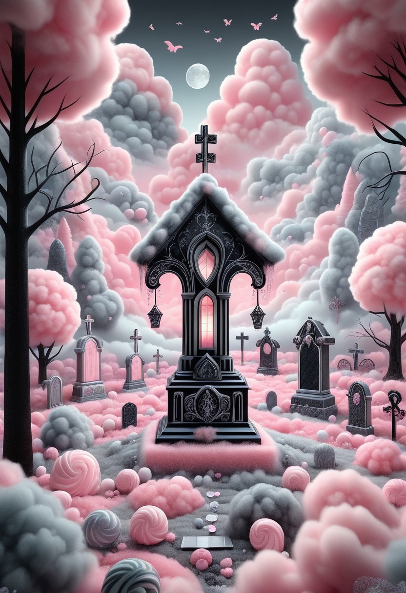 graveyard made of cottoncandy, (black:1.2), (gray:1.2).