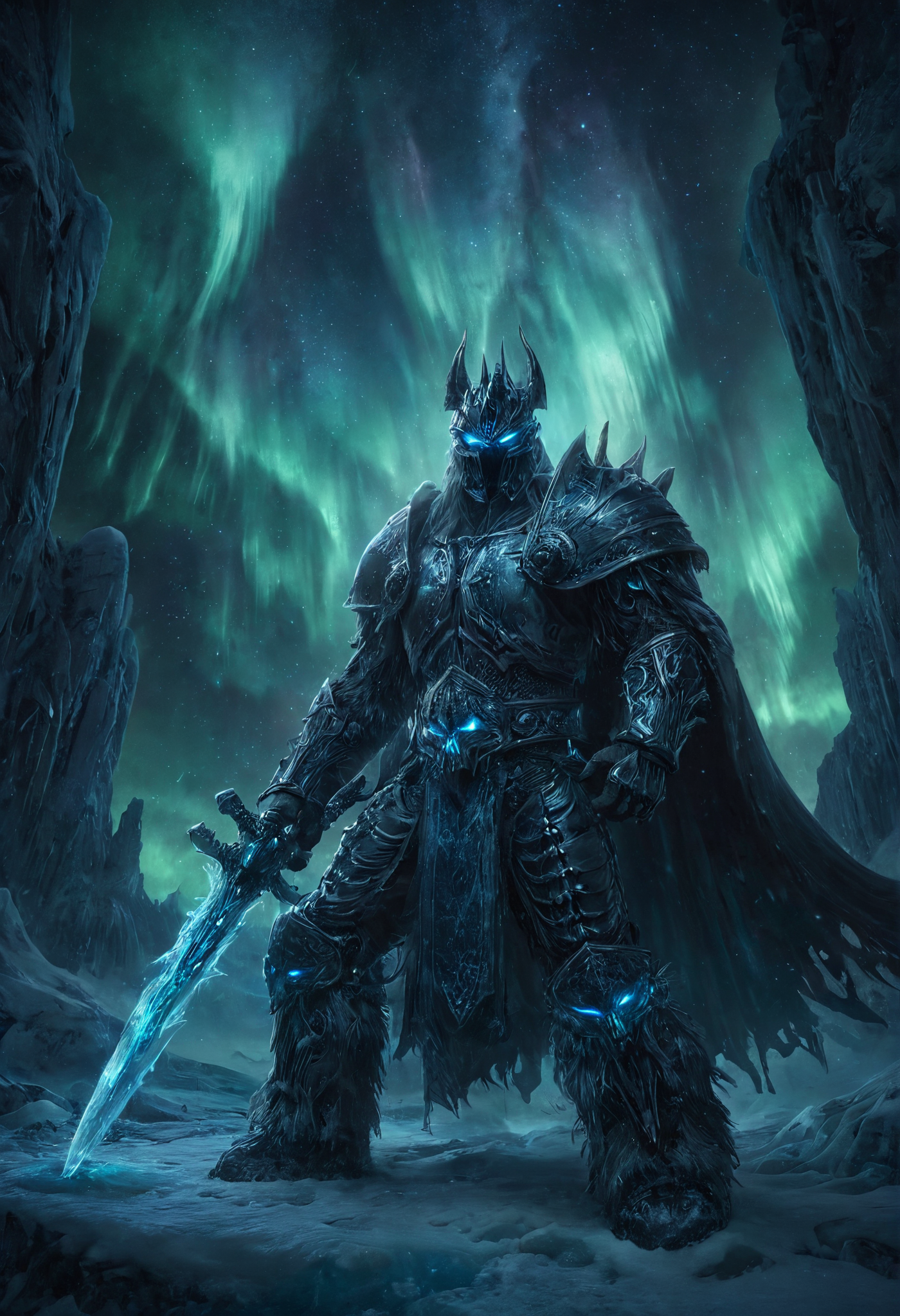 morph-aurora, aidmamj6.1, lichking, wearing helmet, sword, cinematic, realistic, digital art, illustrated art, semi realistic, frostmourne an undead frost king wearing enchanted obsidian armor, glowing with aurora runes, standing atop a frozen throne surrounded by spectral spirits, wielding a massive runeblade crackling with blue lightning, in a surreal arctic landscape illuminated by vibrant aurora lights in the night sky, gothic fantasy style, intricate magical detailing, ethereal particles, majestic and ominous atmosphere