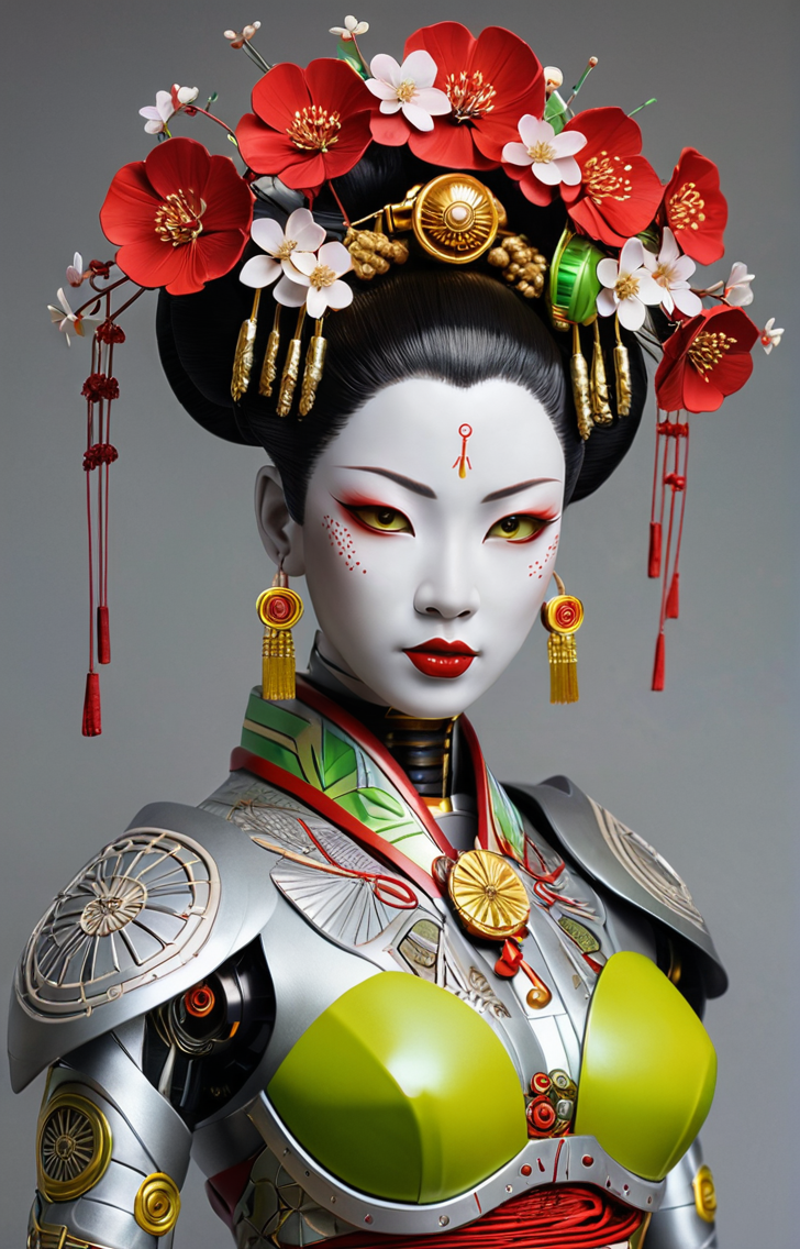 sleek silver metalic bodied robot with red wire-like hair and human eyes,styled as a geisha with traditional Japanese elements,featuring intricate designs of cherry blossoms carved in gold on her cheeks and forehead,and neon yellow highlights in her hair,holding a futuristic fan with silver,white,and green design. bground: shojiillustrator by Sougwen,sharp focus,studio photo,intricate details,highly detailed,by greg rutkowski