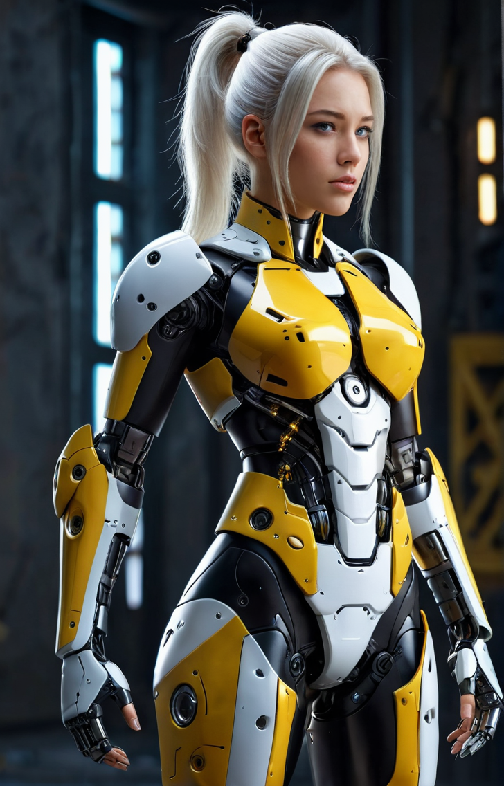 full body pose, (masterpiece, best quality, ultra-detailed, best shadow, amazing realistic picture), cinematic film still, photo of a cyborg (caucasian girl:1.2) with beautiful (robotic body painted black and yellow:1.2), realistic human head, (realistic head, beautiful cute face:1.3), mecha armor, female focus, armor, solo, cape, looking at viewer, blue eyes, blurry background, knee protection, standing, (white hair, messy ponytail:1.3), science fiction, hard surfaces, octane renderer, artstation trending, perfectly shaped metal parts,