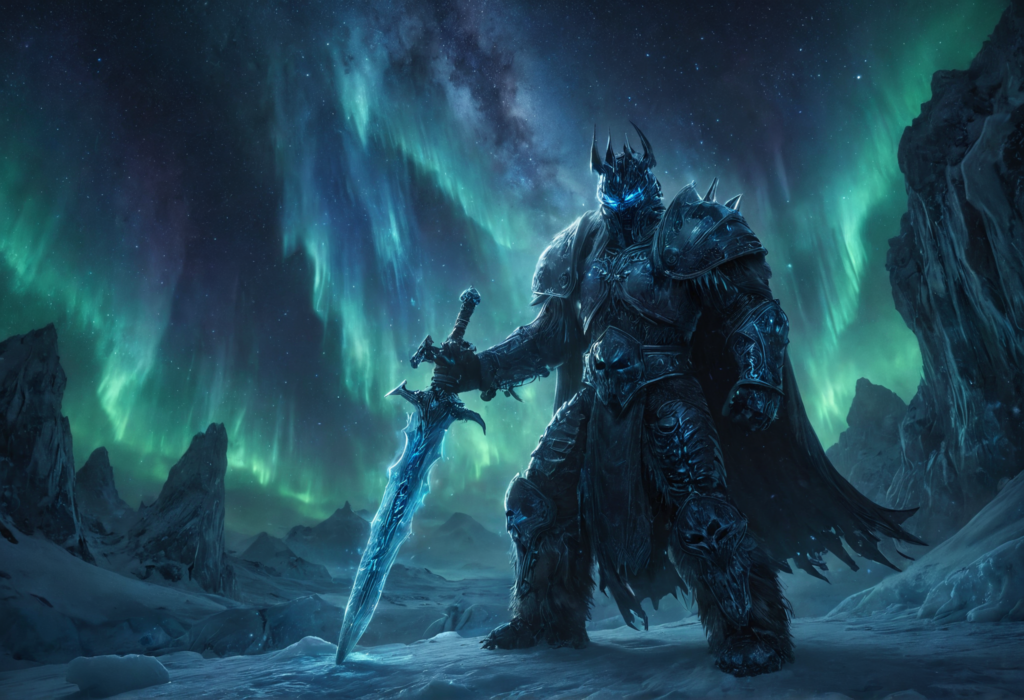 morph-aurora, aidmamj6.1, lichking, wearing helmet, sword, cinematic, realistic, digital art, illustrated art, semi realistic, frostmourne an undead frost king wearing enchanted obsidian armor, glowing with aurora runes, standing atop a frozen throne surrounded by spectral spirits, wielding a massive runeblade crackling with blue lightning, in a surreal arctic landscape illuminated by vibrant aurora lights in the night sky, gothic fantasy style, intricate magical detailing, ethereal particles, majestic and ominous atmosphere