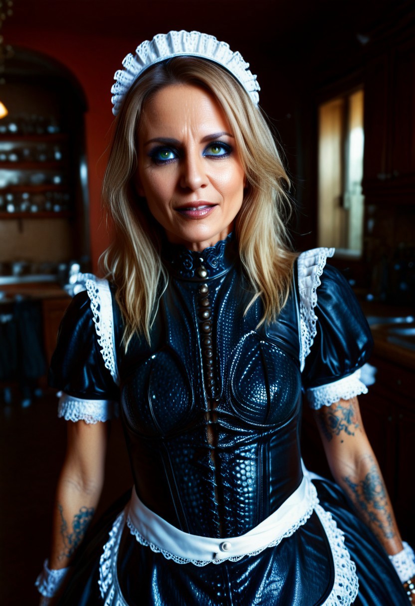 beautiful female, score_9, score_8_up, score_7_up, score_6_up, score_5_up, score_4_up, UHD, 8K, masterpiece, detailed, ultra_high_resolution, lots of detail, OverallDetailXL, detailxl, Masterpiece, 32k, photorealistic:1.4, small waist, fitness body, toned muscles, wide hips, slender legs, high cheekbones, oval face, 32 years old, mature female, milf, makeup, curvy, pretty face, jewelry, solo, seductive smile, sultry, serious stare, stern look, natural skin, long hair, realistic photograph, blond, natural eyes, (Victorian french maid costume made of reptile_skin:2), sitting, (high neck closure:2), (fully dressed:2.6), kpop, wrinkles, laugh lines, (brunhilde_goth:1.7), dark makeup, tattoo, spiked bracelet made_of_reptile_skin, Mature brunette, (large kitchen:1.2), women, natural hands.
