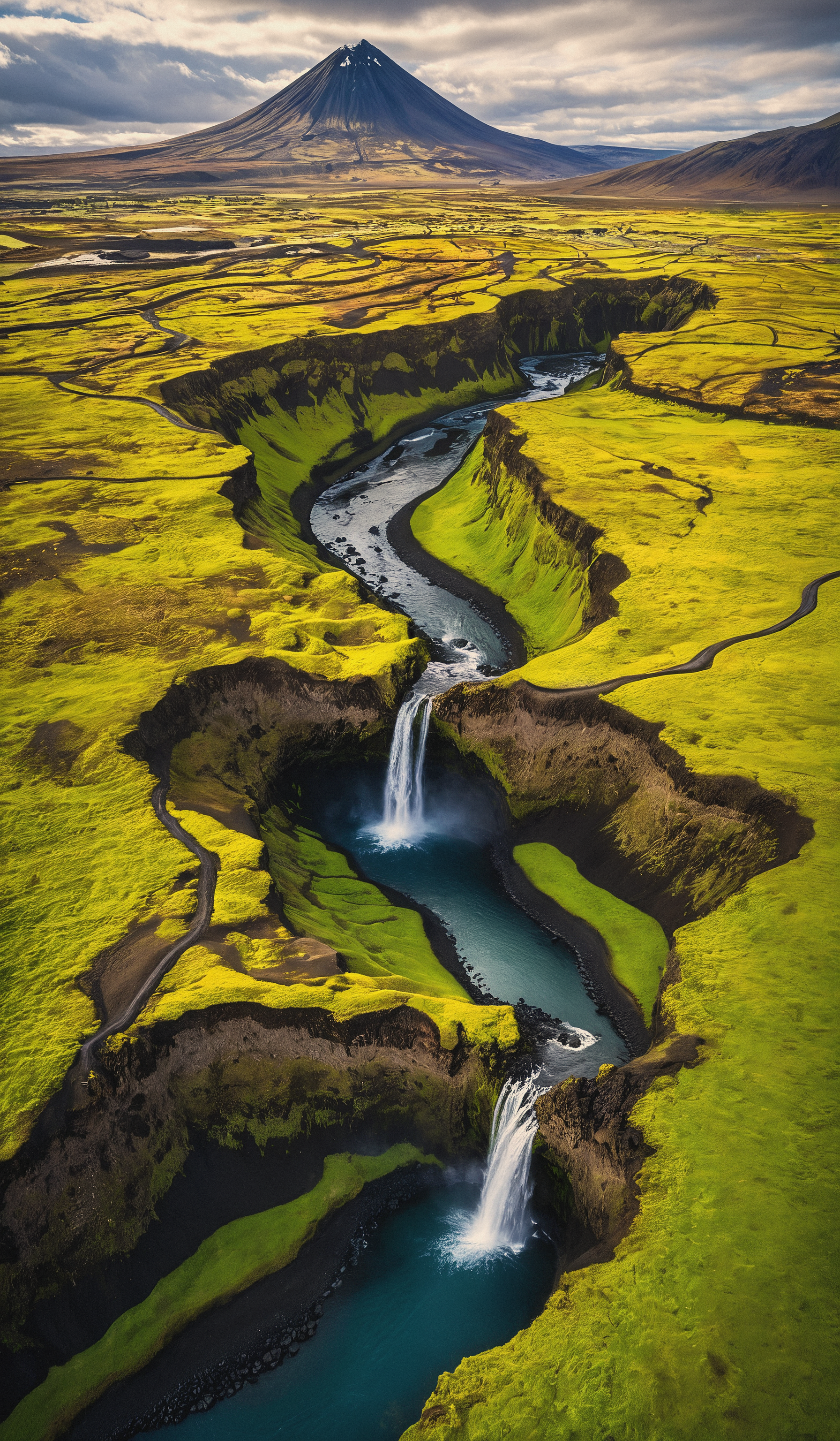 Adventure, Aerial View, Agricultural Field, Awe, Beauty, Beauty In Nature, Canyon, Cliff, Cloud - Sky, Color Image, Discovery, Dramatic Landscape, Drone, Environment, Environmental Conservation, Exploration, Extreme Sports, Extreme Sports Point of View, Extreme Terrain, Famous Place, Geology, Green Color, Hill, Horizontal, Iceland, Idyllic, Island, Journey, Landscape - Scenery, Lava, Majestic, Moss, Mountain, Mountain Peak, Mountain Ridge, Nature, No People, Non-Urban Scene, North, Outdoors, Photography, Ravine, River, Rock - Object, Rough, Scenics - Nature, Sky, Social Issues, Stone - Object, Stone Material, Stream - Body of Water, Summer, Tourism, Travel, Travel Destinations, Uncultivated, Vacations, Valley, Vibrant Color, Volcanic Landscape, Volcano, Water, Waterfall, Wilderness, breathtaking photograph, dramatic light, award-winning, professional, highly detailed . 35mm photograph, film, bokeh, professional, 4k ,minimalistic, daylight, warm atmosphere, cinematic look, simple look, simple style, dramatic scene, unusual scene