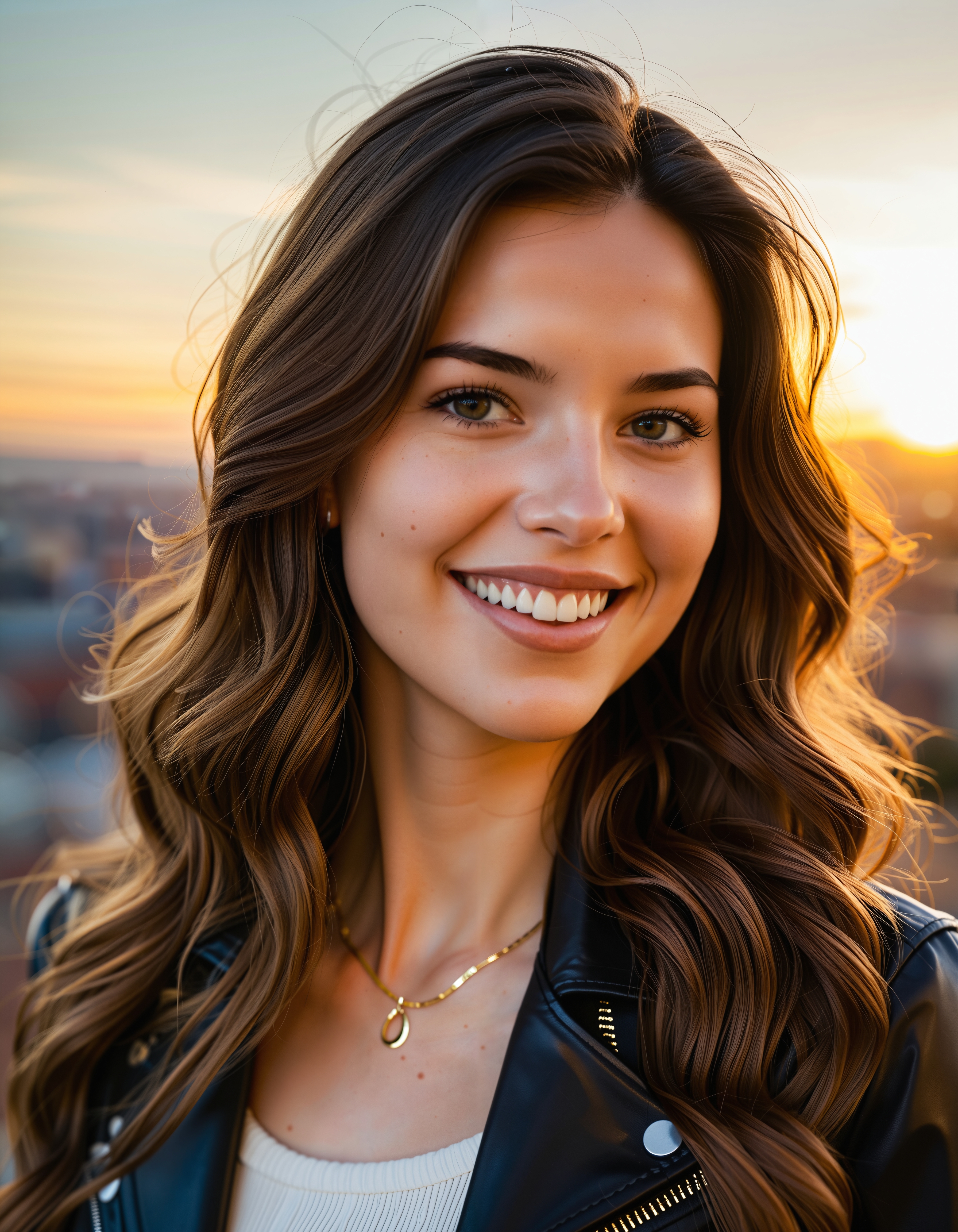 A professional portrait shoot from a portrait camera angle about a young woman with long hairsmiling at the camera during sunset. the image also shows a blurred background of a cityscape with buildings and a sunset sky. on the middle of the image, a 20-year-old woman with light skin appears to be smiling, wearing a black leather jacket over a beige ribbed sweater. she has long, wavy brown hair and is looking directly at the viewer with her realistic eyes. she is wearing gold hoop earrings and a small, delicate necklace. her hair is styled in loose waves and her facial expression is a friendly smile.