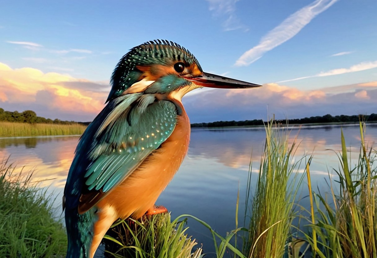 close-up kingfisher, side profile, morning glow background, lake water grass, morning sky with cirrus clouds