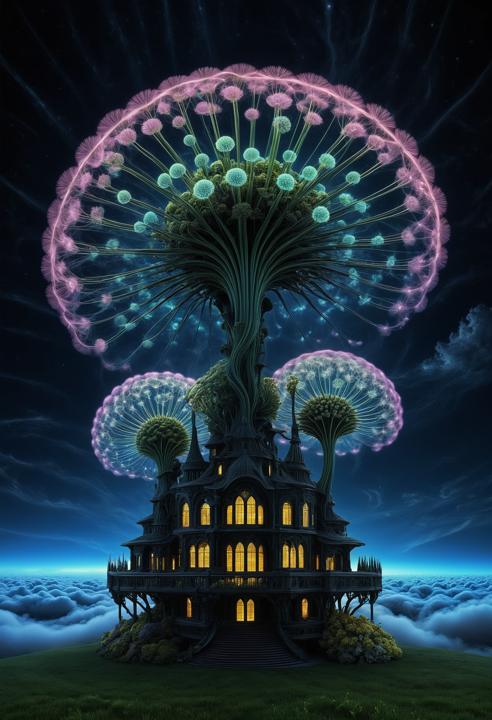 embedding:lazympos, megastructure, fractal, organic, (dandelion:0.6), above clouds, organic, detailed, dark, night, glowing, neon lights, <lora:Challenge_Winnifier_2025-04:0> <lora:Organic_Macabre:1>