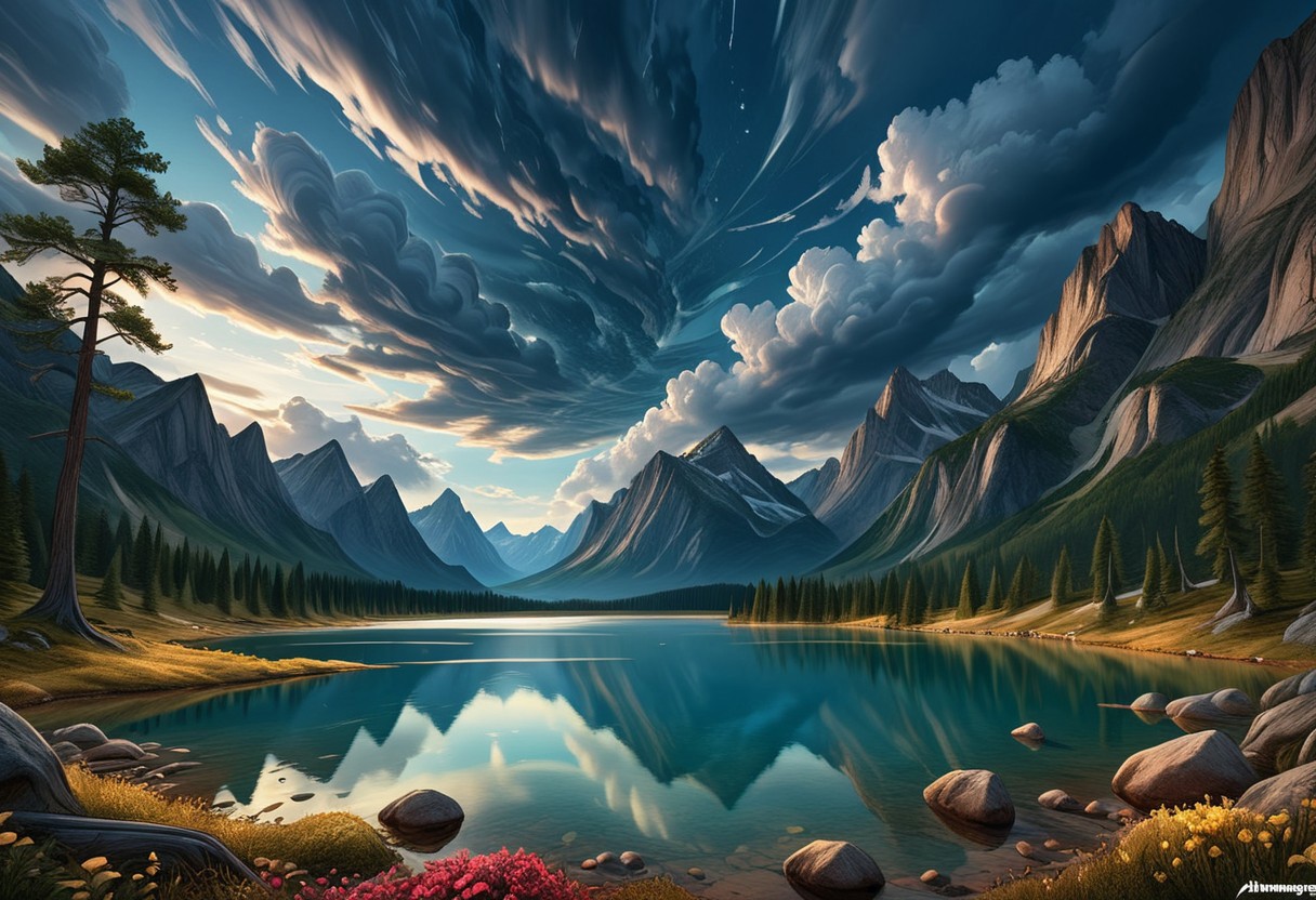 aesthetic, masterpiece, beautiful, elegant, award winning, photo, artstation,best quality, dark clouds, landscape,distorted sky,mysterious lake,view from below, mobe-90c0m, aidmaimageupgrader