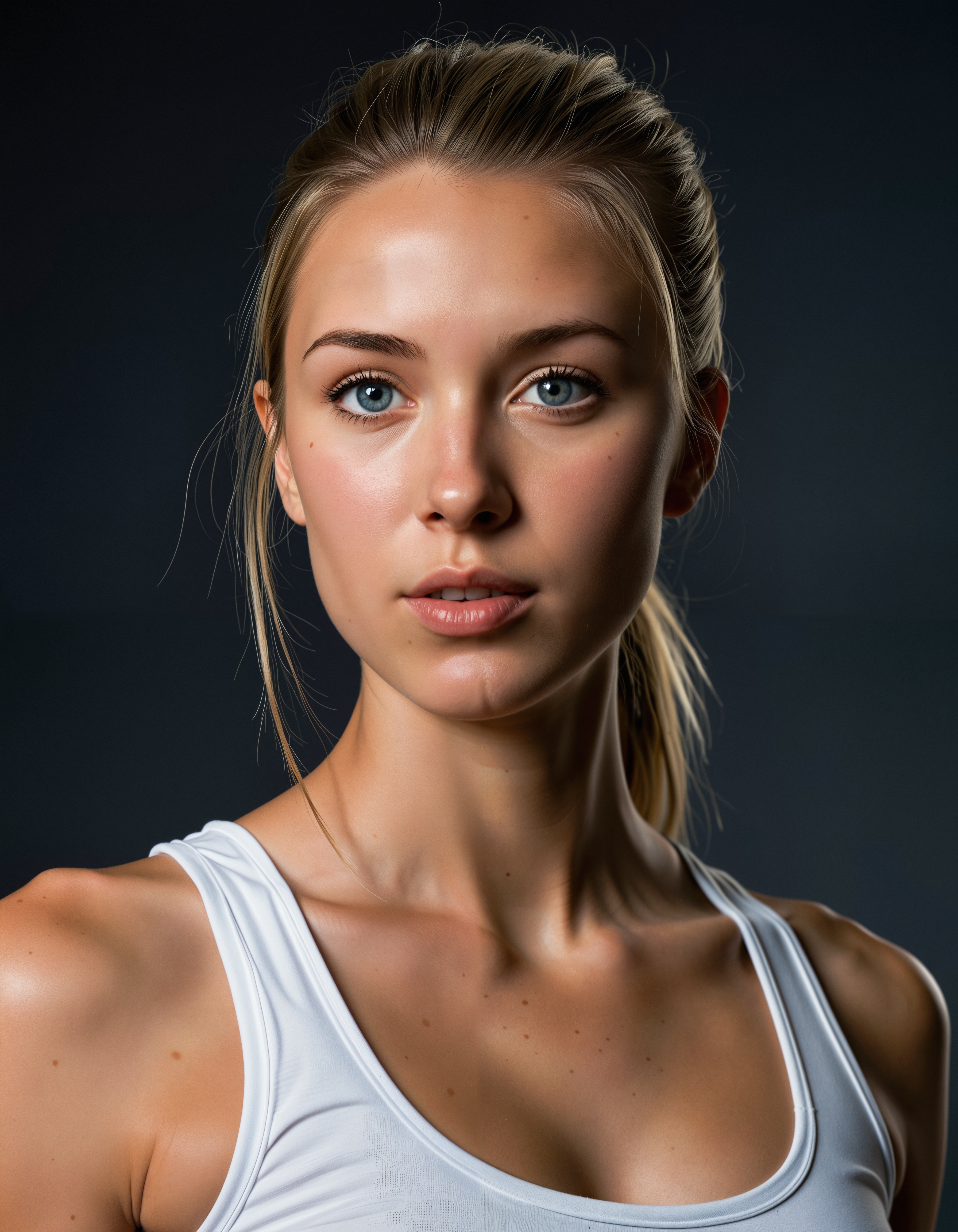 A photo realistic shoot from a profile camera angle about a young woman in a white tank top and gray shorts, posing against a dark, textured background. the image also shows soft lighting and high quality. on the middle of the image, a 20 years old woman with light skin appears to be standing, looking directly at the camera with a neutral expression. she has long blonde hair tied in a ponytail, and her blue eyes are looking straight at the viewer. her slender physique is accentuated by the tank top, which is sleeveless and has a scoop neckline. she is wearing gray shorts and her bare shoulders are visible. her expression is neutral, and she has a slight blush on her cheeks.