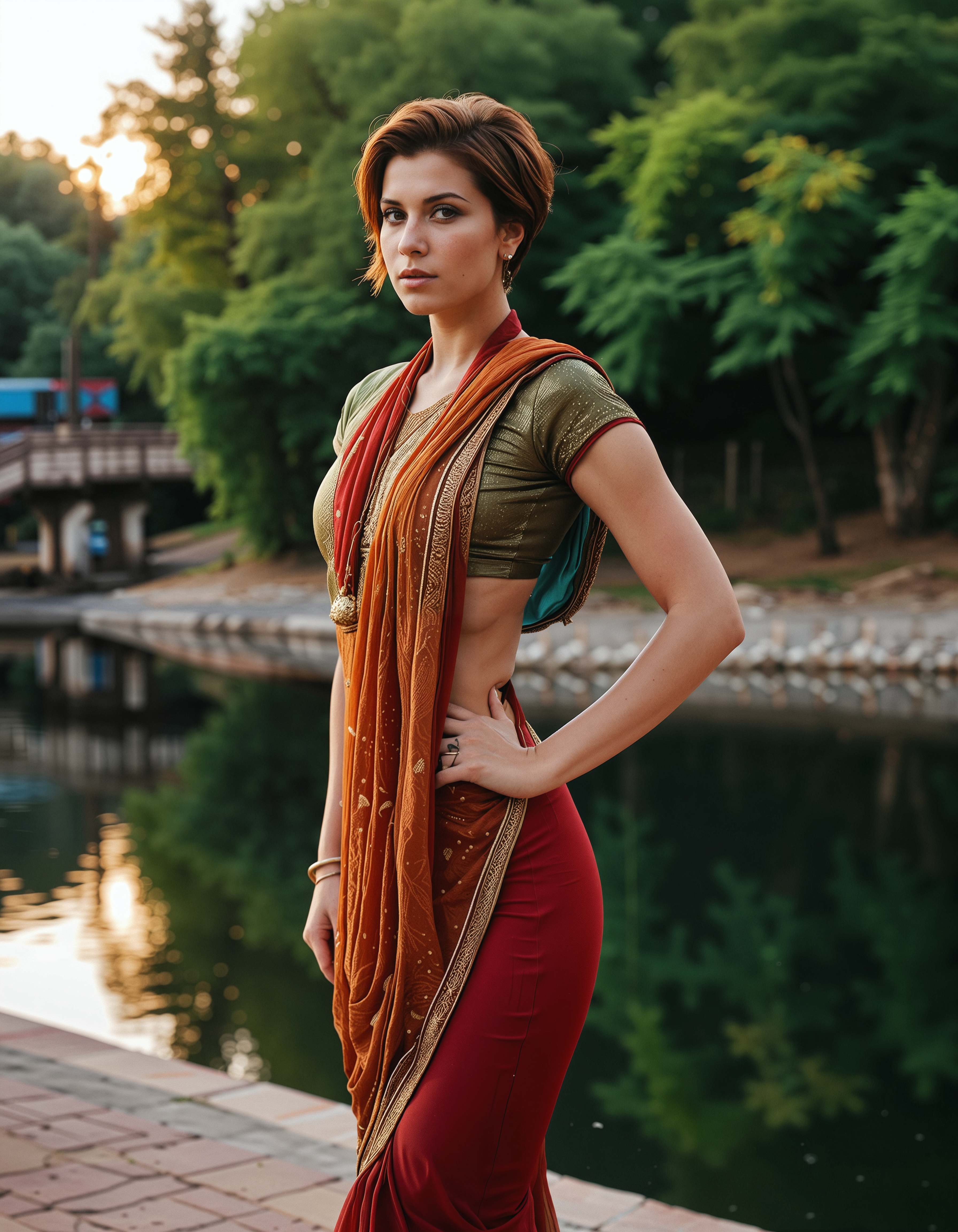 RAW full body analogue photo of a beautiful 25 years old woman, clear focus, high resolution image, (auburn hair Viking woman), ,RAW full body analogue photo of a beautiful 25 years old , high resolution image, Wearing traditional Indian clothes ((Salwar Kameez)), Natural hair, low light, soft natural light, Rembrandt style light, Hasselblad DLSR camera, 200mm Zeiss lens, f/2.8, Camerera view low-angle shot ,Sexy pose, erotic pose, exhibitionism ,Waterfront promenade, (short-hitop-fade-haircut:1.3),,high quality, film grain, Fujifilm XT3, 8k uhd, dslr, film grain, kodak tri-x 400 film, grain photo DOF, faint lighting, dynamic angle, cinematic, Depth of field, bokeh, best quality, cinematic, light particles, highly_detailed, very_aesthetic, golden hour, beautiful_and_aesthetic ,Sexy pose, erotic pose, exhibitionism, ,Watermill