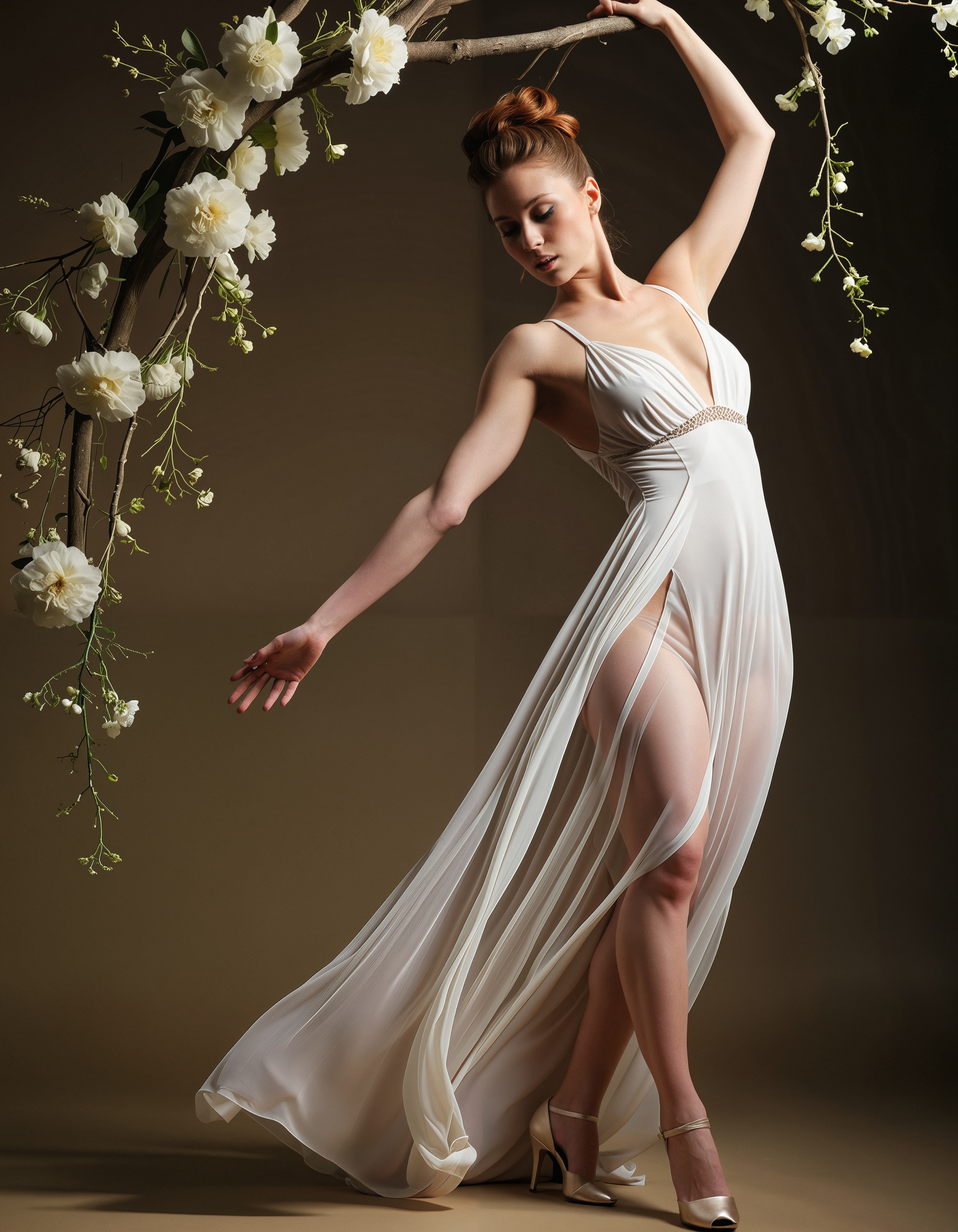 RAW full body analogue photo of a beautiful 25 years old woman, clear focus, high resolution image, Jane_auburn, beautiful auburn haired woman, <lora:Jane_Auburn_SDXL:0.8>, ,wearing a fitted leotard with a chiffon overlay that drapes elegantly over the hips, accentuating the dancer's movements, The dress is paired with soft canvas ballet shoes, (Gretchenfrisur hairstyle:1.6),,low light, soft natural light, Rembrandt style light, Hasselblad DLSR camera, 200mm Zeiss lens, f/2.8 ,Sexy pose, erotic pose, exhibitionism, ,ancient tree of life with otherworldly blossoms