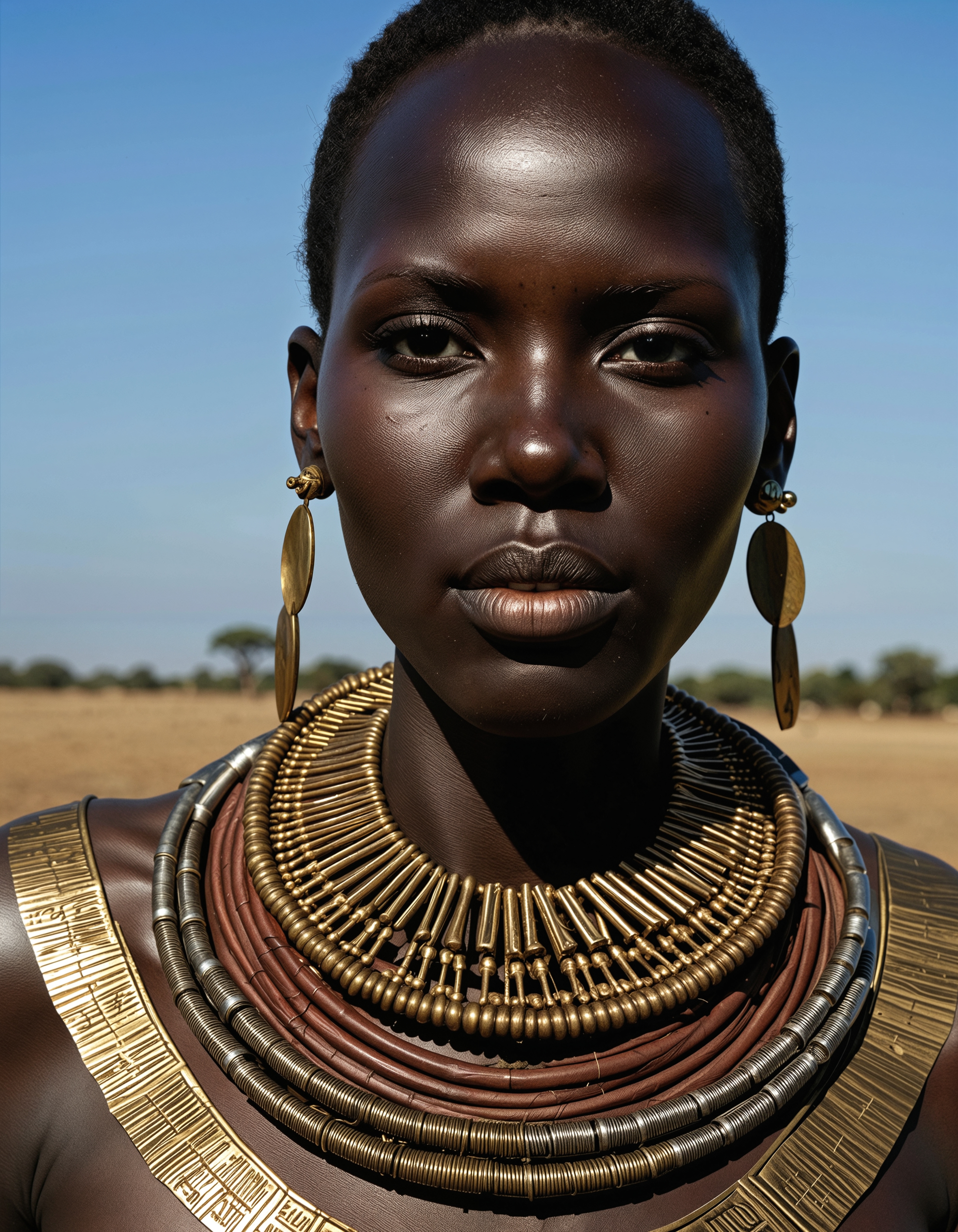 Female-Militia-Tribal, Hyperrealistic art, cinematic, cinemascope, movie-still, UHD, full-body portrait of a female member of the Dinka tribe from South Sudan, with tall, lithe stature, striking almond-shaped eyes, and deep black ebony skin that reflects the sun’s glow. She wears minimalistic attire, a draped leather shawl, and neck rings, both worn and marked by years of sun exposure. Her head is shaved, highlighting her bone structure, and her wrists are adorned with traditional brass bracelets. The setting features the open, grassy plains of the Nile Valley, with a bright blue sky and towering acacia trees in the distance.