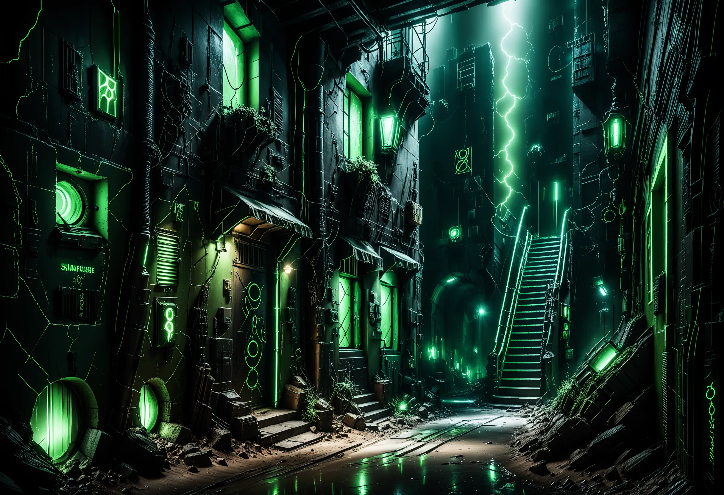 masterpiece, best quality, amazing quality, very aesthetic, very awa, highres, highly detailed, detailed shading, cinematic, volumetric lighting, 35 mm photo, high detail, ultrarealistic, 8k, wide shot,From below BREAK underground black‑market passage in a dark SF‑fantasy city, dimly lit, cracked ceiling and winding stairwells above let shafts of daylight fall like divine beams, dust sparkling in the light, damp stone walls, eerie and unsettling mood, accents of toxic green neon light flickering, crowded stalls, shadowy androids and alien species bartering ,Necron,electricity, green glow, green theme <lora:add-detail-xl:1> <lora:cfg_scale_boost:0.4> <lora:Necron_World_XL:1>