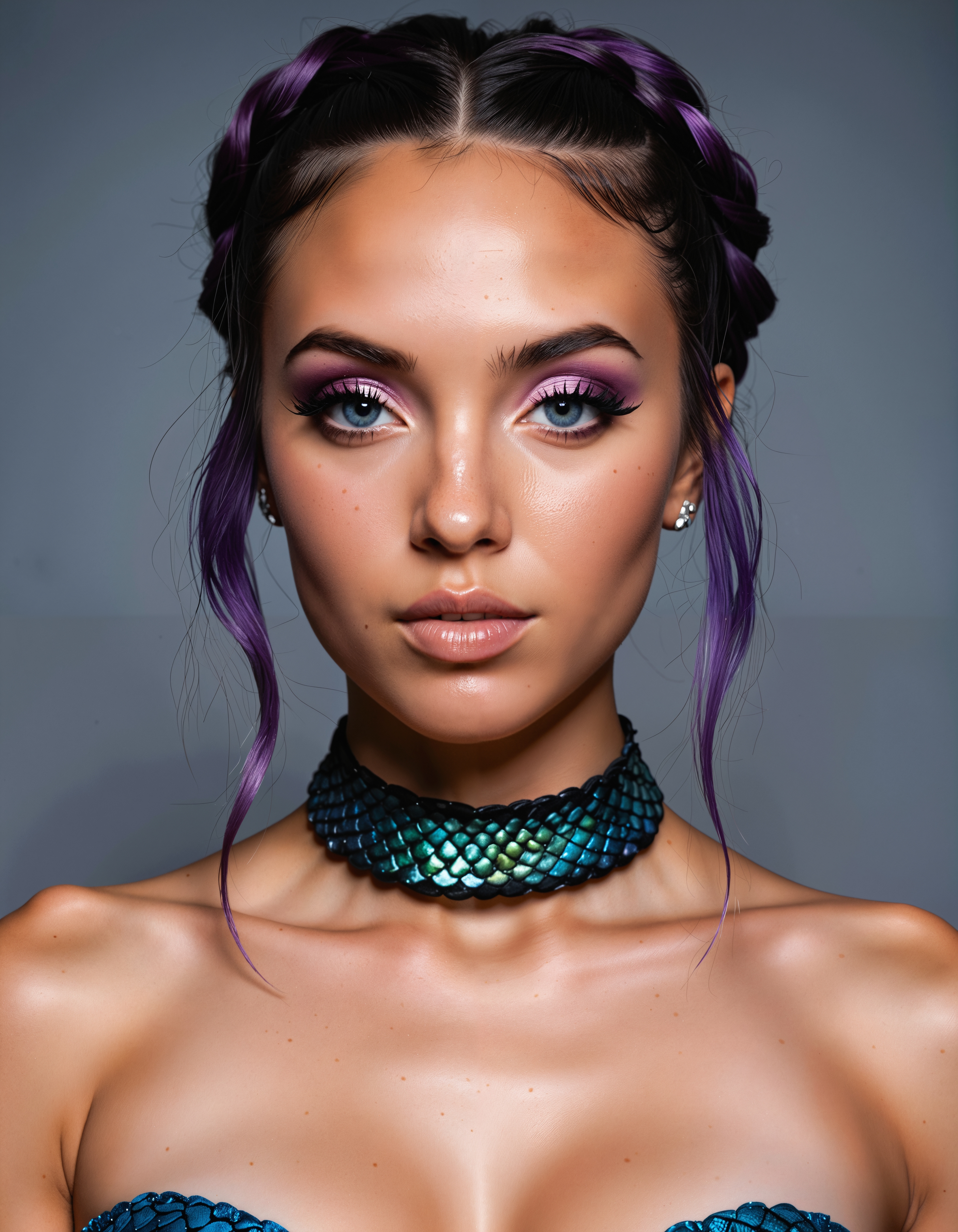 A photo-realistic shoot from a portrait camera angle about a woman with a mermaid-like appearance, showcasing intricate scales in vibrant colors. the image also shows a dark background and a focus on the subject. on the middle of the image, a woman who appears to be in her mid-twenties, with fair skin, blue eyes, and purple hair styled in a single braid. she is facing the viewer with a neutral expression, looking directly at the camera. her body is slim with bare shoulders and medium-sized breasts, and her nipples are visible. she has tattoos on her arms and chest, and she is wearing a black choker with a silver chain around her neck. her hair is styled in an updo and her makeup is dramatic, with eyeshadow and eyeliner.