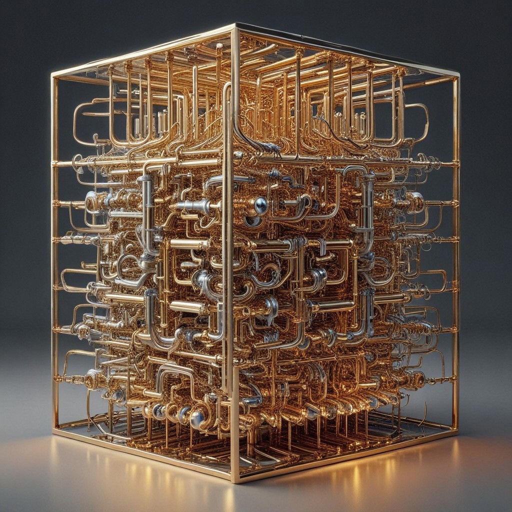 raw photograph of a surreal cube constructed entirely of interwoven brass pipes in qu4ntum style, glowing silver wires spiraling along the edges, intricate golden circuitry engraved across the surfaces, quantum energy pulses radiating softly from its hollow core, set against a dark void with swirling neon energy trails