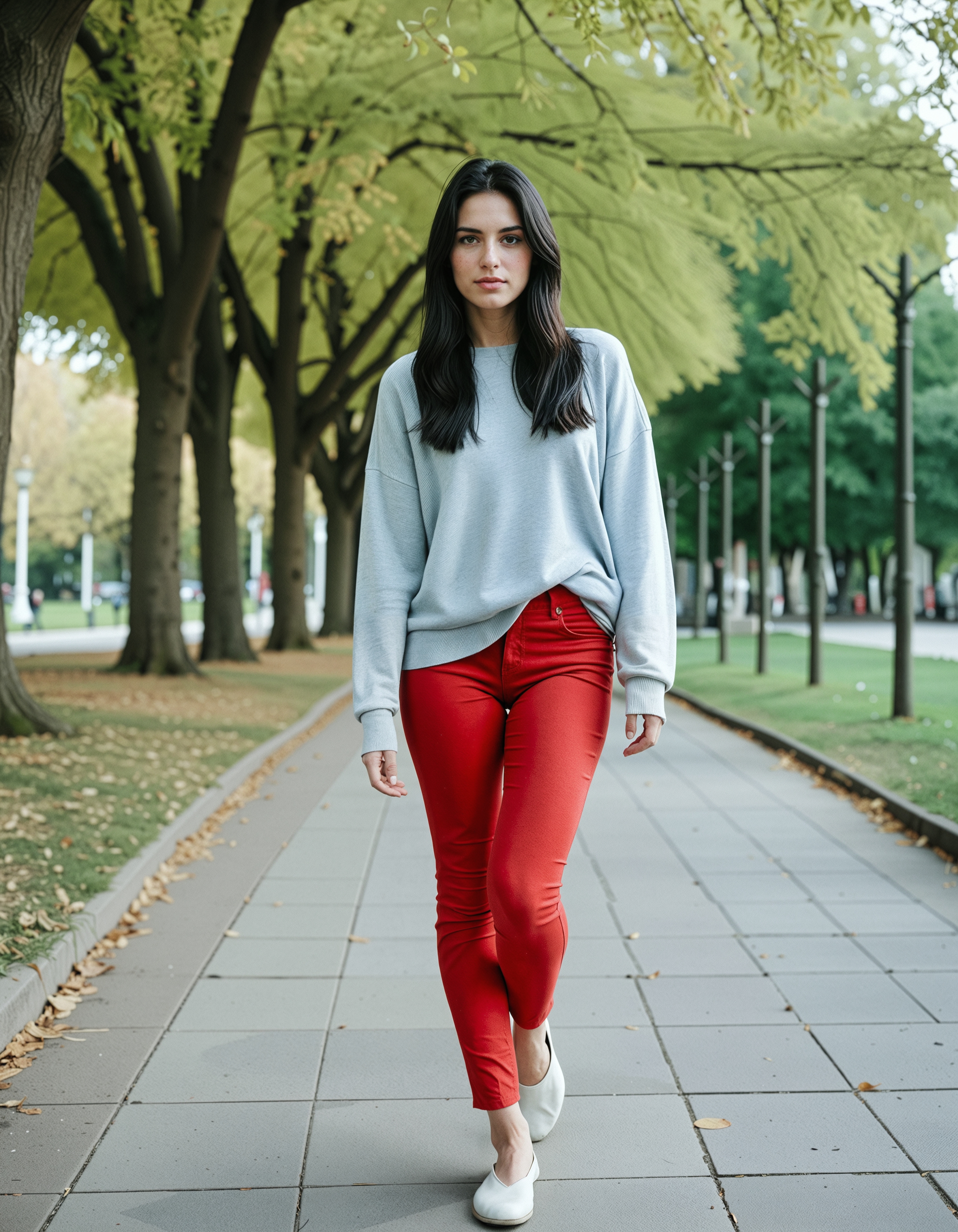 RAW full body analogue photo of a beautiful 25 years old woman, clear focus, high resolution image, Ms KMXD, black hair, <lora:MS_KMXD_SDXL_V1:1.0> dark hair Caucasian, Arab? ,wearing red jeans, grey sweater, red flats, ,,high quality, film grain, Fujifilm XT3, 8k uhd, dslr, film grain, kodak tri-x 400 film, grain photo DOF, faint lighting, dynamic angle, cinematic, Depth of field, bokeh, best quality, cinematic, light particles, highly_detailed, very_aesthetic, golden hour, beautiful_and_aesthetic ,Sexy pose, erotic pose, exhibitionism, ,A bustling city park with jogging paths and playgrounds
