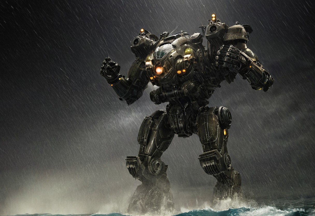 Pacific Rim Striker Eureka, Giant Mecha, Streamlined design, Fighting against monsters in the eye of a deep sea storm, in a thunderstorm, in a dark and lonely atmosphere, very realistic photography
