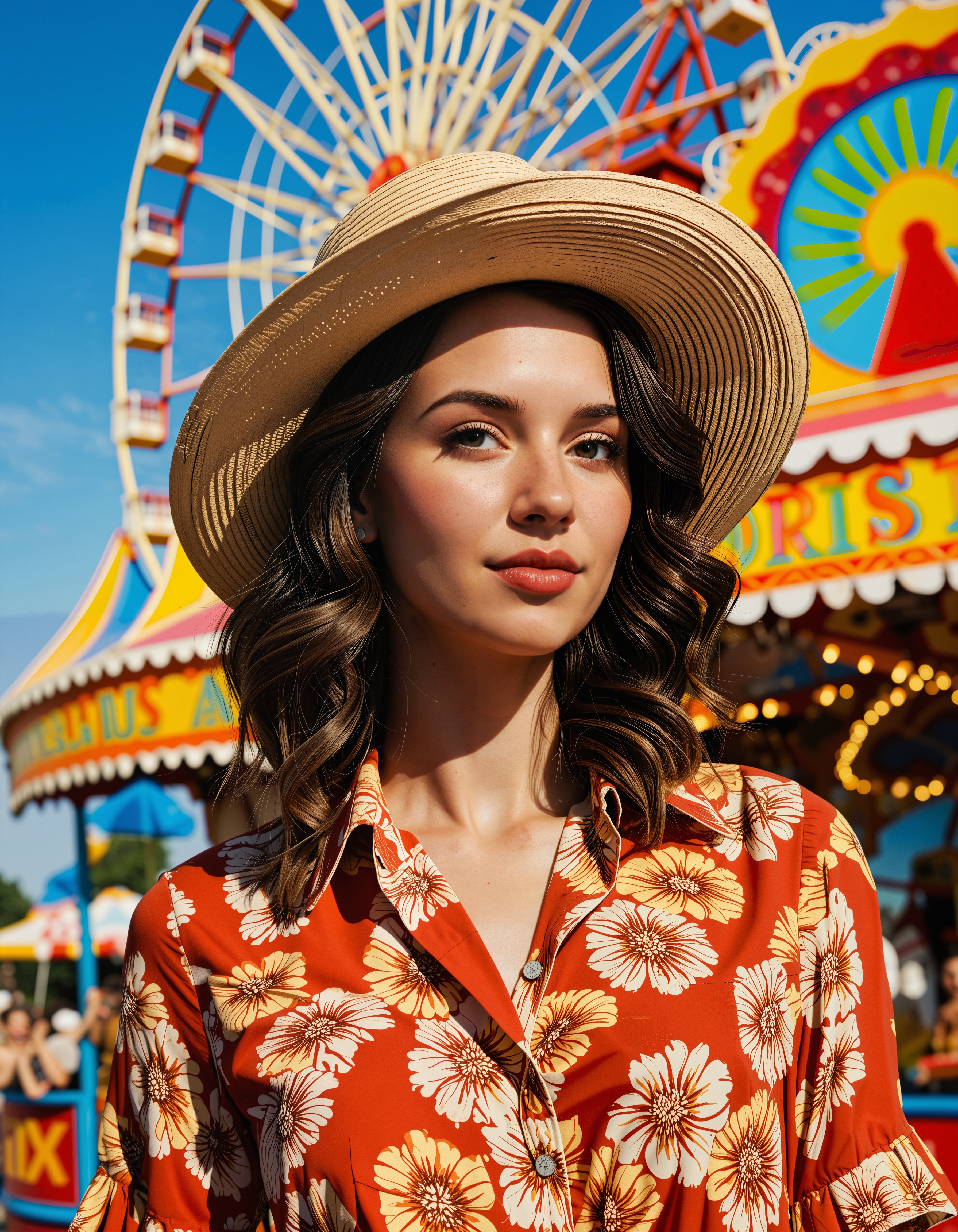 A photo-realistic shoot from a close-up camera angle about a woman wearing a straw hat and an orange floral shirt, standing in an amusement park setting. the image also shows a colorful carnival booth and a ferris wheel in the background. on the middle of the image, a 20-year-old woman with light skin and dark brown hair appears to be looking directly at the camera with a slight smile, her brown eyes are looking at the viewer, her lips are parted slightly. she has a slim body and is wearing a red floral shirt with a button-up front. her hair is styled in loose curls and her eye color is brown. she is standing in front of a carnival rides with colorful signs and a clear blue sky.